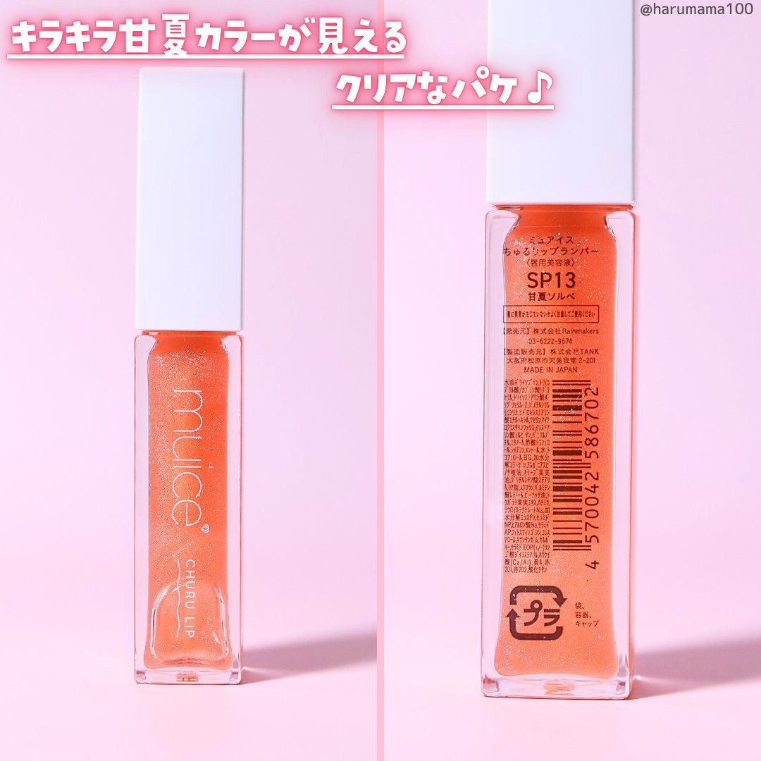プランパー好きにはたまらない🩷みきぽんコスメ🩷✼••┈┈••✼••┈┈••✼••┈┈••✼••┈┈••✼◯muiceちゅるリップランパーSP13甘夏ソルベ社会人になった当初からもう10年くらいずっとみきぽんファンな私!YouTubeも欠かさず見ています(笑)そんな愛してやまないみきぽんのコスメ!!muice8月限定新作やっとやっとやーっと!!!購入できた!今まで家が田舎すぎてなかなかどこにも売ってなかったから見つけたときには少し嬉し泣きしてしまいました(笑)🩷8月の新作、フルーティーなビタミンカラー🩷トウガラシエキス配合で、縦ジワの目立たないキメの整った唇に🩷大小異なる大きさのラメ&パールを配合したトリートメント効果のあるオイルリップ🩷テクスチャーは重め🩷豊富な保湿成分でしっとり潤う保湿成分・ビタミンE(酢酸トコフェロール)・アルガニアスピノサ核油・オリーブ果実油・ピーナッツ油・ハチミツ・スクワラン・パルミチン酸レチノール・加水分解エラスチン・加水分解コラーゲン・セラミドNP・セラミドAP・セラミドEOP・ヒアルロン酸Na・グリチルレチン酸ステアリル塗った瞬間言葉を失いました。とにかくいい。悪いところがみあたらない!時間が経っても唇はプルプル🩷絶対にリピートします!!#muice#ちゅるリップランパー#限定#みきぽん#夏のお供紹介します