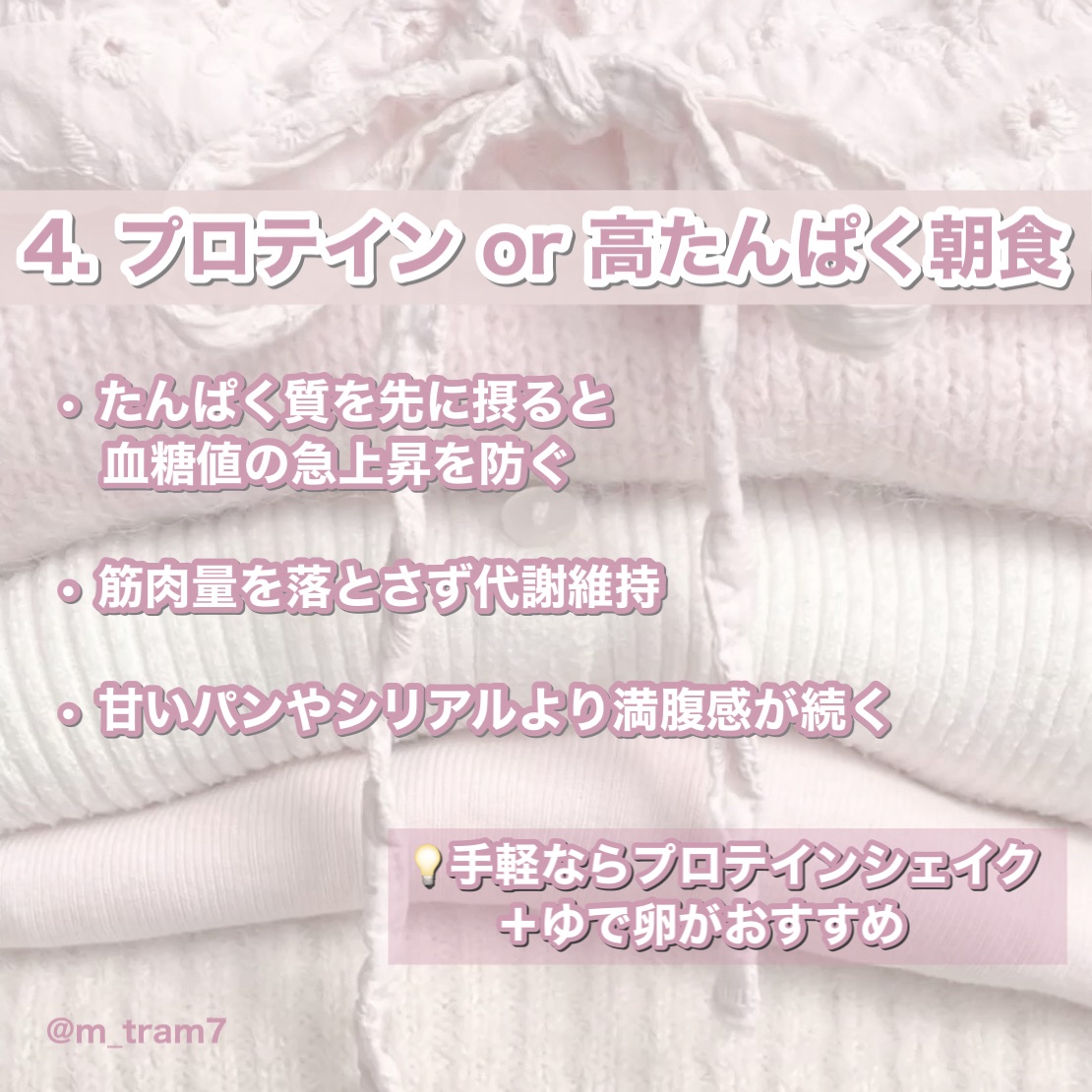 日々の習慣で痩せやすく🕒💪🏻💕朝の5~15分程度で痩せやすい身体を目指す❕自身の生活に合わせてできることから実践📝———————————————🔗痩せやすい体づくり習慣———————————————1.起きたらコップ1杯の常温水•就寝中に失われた水分を補給 •内臓が目覚め、代謝スイッチが入る•便通改善にも◎💡レモン水や白湯にするとデトックス効果UP2.太陽光を浴びる(2〜3分)•セロトニン分泌→自律神経が整う•体内時計がリセットされ、 代謝リズムが整う•朝日を浴びるだけで脂肪燃焼 ホルモンも活性化💡窓際で浴びるだけでもOK3.軽めのストレッチ・有酸素運動(3〜5分)•寝ている間に硬くなった筋肉をほぐし、 血流UP•軽く心拍数を上げることで 脂肪燃焼モードに•腸の動きも活発になる✅おすすめ動き•背伸び+深呼吸 →全身の酸素巡りが良くなる•キャットカウ →背骨を動かして代謝UP•その場足踏みor軽いスクワット →脂肪燃焼スイッチON4.プロテインor高たんぱく朝食•たんぱく質を先に摂ると 血糖値の急上昇を防ぐ•筋肉量を落とさず代謝維持•甘いパンやシリアルより満腹感が続く💡手軽ならプロテインシェイク +ゆで卵がおすすめ5.深呼吸&姿勢リセット(1〜2分)•姿勢が整うと呼吸が深くなり、 消費カロリーUP•交感神経が優位になり脂肪燃焼モードに•猫背や巻き肩の改善で血流、 リンパの流れがよくなる⛅️朝習慣の例(10分以内)1.常温水を飲む(1分)2.カーテンを開けて朝日を浴びる(2分)3.その場足踏み+背伸び(3分)4.プロテインシェイクを飲む(3分)5.背筋を伸ばして深呼吸(1分)→朝から代謝が上がり、 1日の消費カロリーが自然に増えます💪🏻#新シーズンあか抜け計画#垢抜け#垢抜ける方法#ダイエット