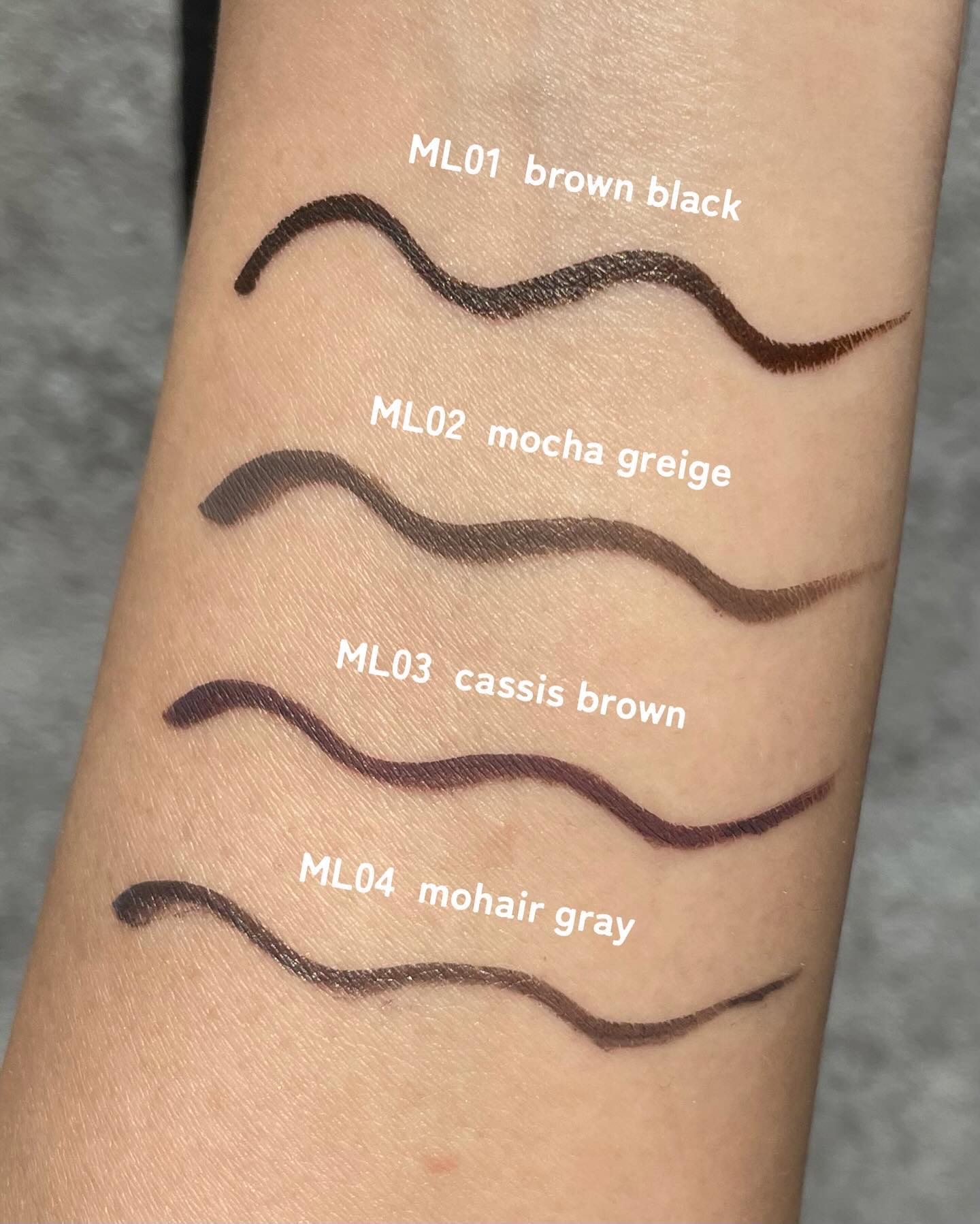 見た目よりナチュラルな仕上がりで使いやすい🙆♀️ ナチュラル派にもオススメ😊 メロウシェードリキッドライナーは、全4色なのです!ラテ系のカラー展開でナチュラだし可愛い🤎 ブラシは適度なコシがあってなめらかな塗り心地でした😆