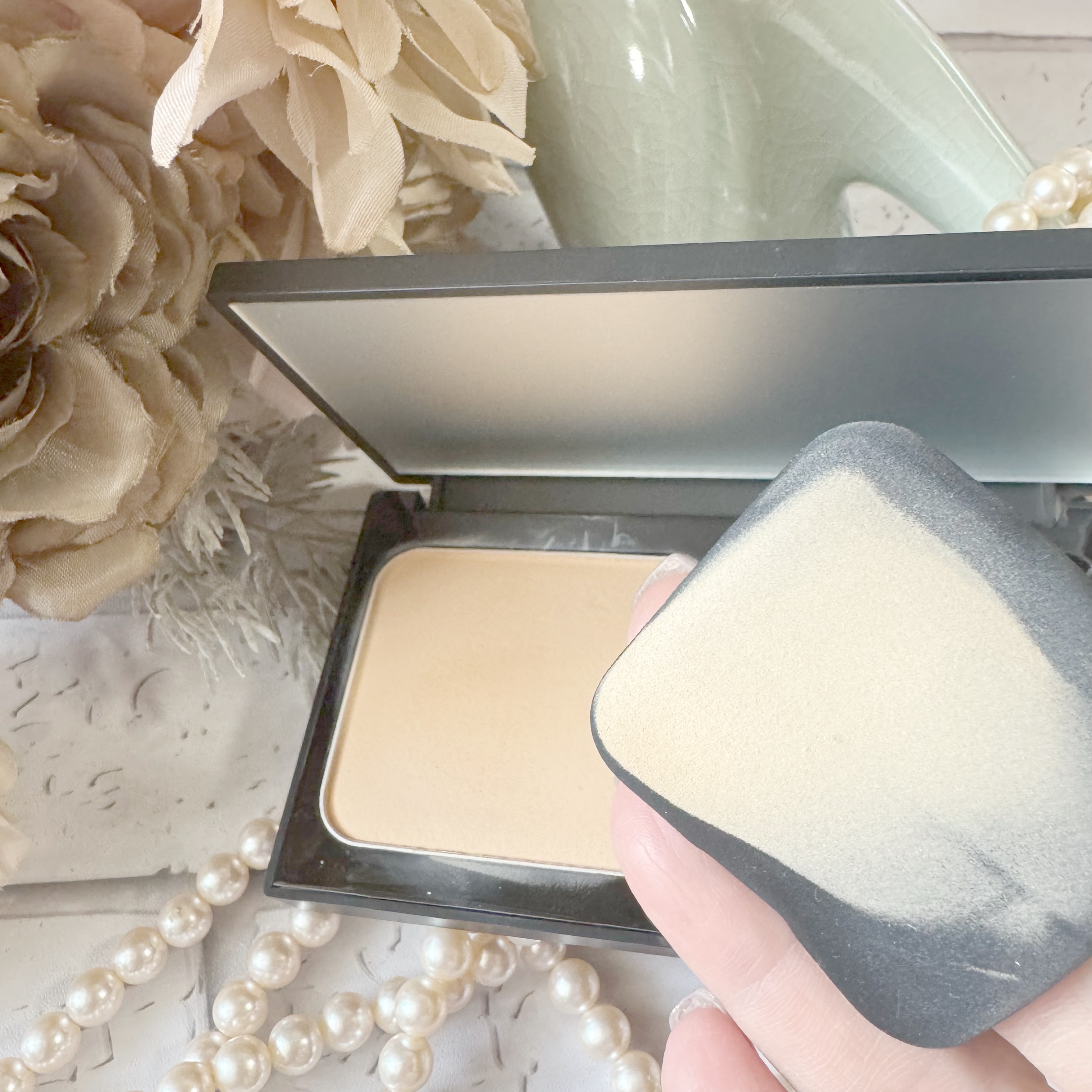 パウダーファンデーションをクッションパフでつける⁉️ ん…なに⁇どゆこと⁇ これが、パウダーなのに粉っぽさを感じない一番のポイントなんだって☝️ パウダーファンデーションとは思えない、ヘルシーでツヤやかな仕上がりに感動🥹