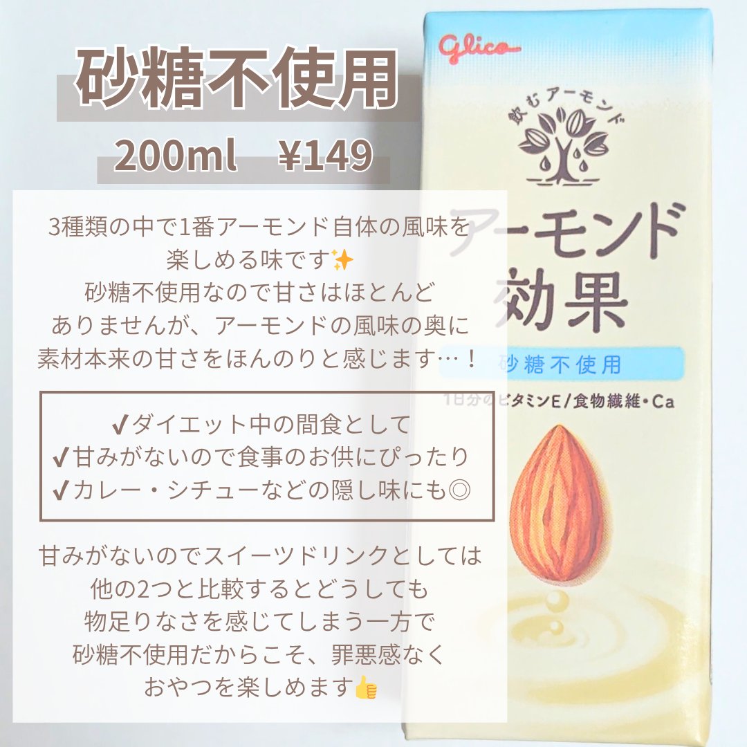 【1日分のビタミンE アーモンド効果3種比較】✼••┈┈••✼••┈┈••✼••┈┈••✼••┈┈••✼グリコ アーモンド効果オリジナル/3種のナッツ 各¥138砂糖不使用 ¥149✼••┈┈••✼••┈┈••✼••┈┈••✼••┈┈••✼【オリジナル】アーモンド効果といえばこれ!「Theアーモンドミルク」という表現がぴったりな、クセのない定番の味です✨そのまま飲んでもばっちりおいしくて、ほの甘いはちみつの風味も楽しめるのでスイーツドリンクとしてもぴったりです🍯アーモンド効果は種類豊富で迷ってしまうこともしばしばですが、初心者さんは迷ったらとりあえずコレを買っておけば間違いなしです👍【3種のナッツ】パッケージではナッツが強調されていますが、私は飲んでみた感じではあんまりオリジナルと変わらないように感じました。意外とナッツ感が控えめというか、オリジナルが十分ナッツ感が強いため違いが分かりづらいというか…とにかく、身構えていたほど風味にクセはない感じでした。(※同時に飲み比べしたわけではなく、ざっくりとした感想なので、あくまで「個人の意見」として参考程度にしていただけたら幸いです)栄養成分としては今回比較した3種の中で唯一鉄分が入っているので、生理中の女性など鉄分を積極的に摂取したい人はこれがオススメです!【砂糖不使用】3種類の中で、一番アーモンド自体の風味を楽しめるのがこちら!砂糖不使用なので甘さはほとんどありませんが、アーモンドの風味の奥に素材本来の甘さをほんのりと感じられる味です✨そして砂糖不使用の一番のおすすめポイントは、何と言ってもダイエット時の間食にぴったりなところ!甘みがないのでスイーツドリンクとしては他の2つと比較するとどうしても物足りなさを感じてしまいますが、砂糖不使用だからこそ、罪悪感なくおやつを楽しめちゃいます!また、甘み0だからこそ食事にも合わせやすいのもありがたいポイント◎個人的にはカレーやシチューなどの料理に加えるアレンジがお気に入りです✨全種類共通して✔いつもの食事にプラスするだけで、1日分のビタミンEを手軽に補給できる✔栄養サポートになるのに、スイーツ感覚で楽しめちゃう✔そのまま飲むのはもちろん、アレンジレシピも多数あるので可能性は無限大…!というのが特徴です。コンビニやスーパーなどで売っているので、見かけたらぜひチェックしてみてください✨#グリコ#アーモンド効果#ビタミンE#鉄分#オリジナル#3種のナッツ#砂糖不使用#比較#ダイエット