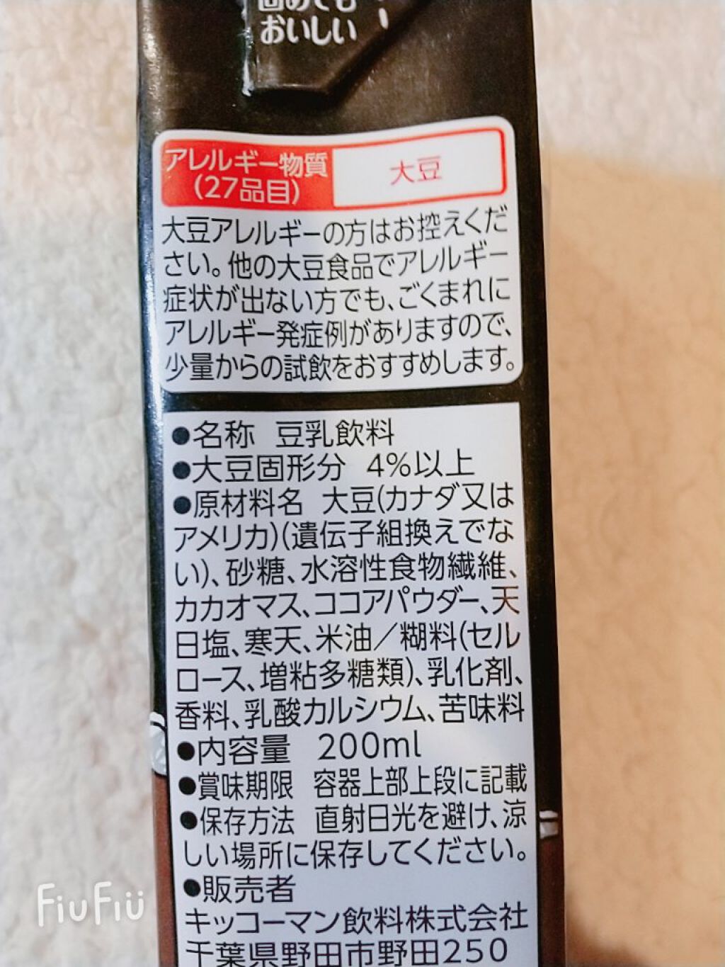 こんにちは、こんばんわ!うみです!今回は!キッコーマン豆乳飲料ブラックチョコ90円+税→(きっと、笑)をレビューしたいと思います!最後まで読んでくれると嬉しいです!では、スタート!❀―❀―❀―❀―❀―❀―❀―❀―❀―❀―❀―❀ブラックチョコのビターでコクのある味わいが特徴の豆乳飲料です。豆乳アイス、豆乳プリンなどさまざまなアレンジも可能。乳原料・卵不使用で、コレステロールゼロ。「食物繊維」配合。栄養成分200mlあたり熱量104kcalたんぱく質4.2g脂質3.3g飽和脂肪酸0.50gコレステロール0mg炭水化物16.5g糖質12.1g食物繊維4.4g食塩相当量0.23gカリウム246mgポリフェノール181mgイソフラボン25mg❀―❀―❀―❀―❀―❀―❀―❀―❀―❀―❀―❀まず、すごく美味しいです!豆乳と言われないと分からないぐらいです!私は、豆腐はもちろん。豆腐を使った料理が、ほんとに苦手で、いつも、残してしまうくらいなのですが、。これは、めちゃ美味しいです!冗談なしに!本当に美味しいです!苦くもなく、甘くもない、ちょうどいい感じです!最後まで読んでくださりありがとうございました!!次の投稿も読んでくれると嬉しいです!!♥💬+👤よろしくお願いします!!#キッコーマン#豆乳#ダイエット#育乳#ブラックチョコ