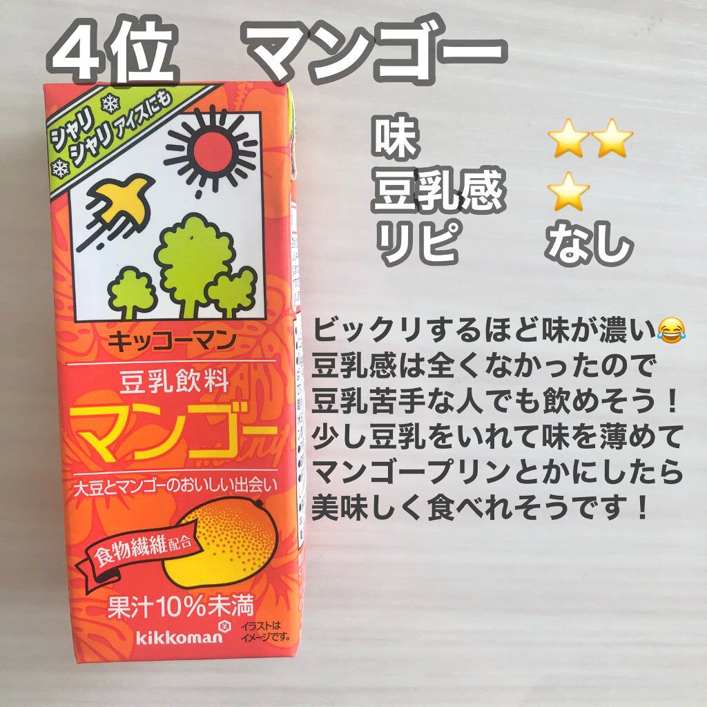 ❀キッコーマン豆乳飲料レビュー❀-------------------------------------------------------------------キッコーマン豆乳飲料マカダミアナッツ杏仁豆腐-------------------------------------------------------------------※豆乳プリンについてはそのまま飲むのと味がほとんど変わらない場合があるのでレビューは一部省略させていただきます。・マカダミアナッツ122kcal[原材料]大豆(カナダ又はアメリカ)(遺伝子組換えでない)、砂糖、米油、マカダミアナッツペースト、天日塩、寒天/糊料(セルロース、増粘多糖類)、乳化剤、香料、ビタミンEそのまま飲む★★★★☆豆乳アイス★★★★★豆乳プリン★★★★★ホッ豆乳★★★☆☆マカダミアナッツの香りが強く濃厚で甘めな豆乳です。でも豆乳感はそこまでないです。少し甘すぎるかなと思いますが、お菓子のように味わえる一品です!豆乳アイスにすると、クリーミーでアイスクリームのようになります。味もそこまで薄まらずにおいしく食べられます!!個人的に豆乳アイスにするならマカダミアナッツは絶対に外せない味です!そのまま飲むなら甘すぎますが、豆乳アイスにするとちょうど良いですホッ豆乳にすると、かなり甘味が強くなります。甘党の方は楽しめると思いますが、200ml全部をホッ豆乳で飲むならかなりクドいかなと思います。マカダミアナッツの香りもしっかり残っていて全くマズくはないですが、私なら温めずにそのまま飲みます。結論、マカダミアナッツは何にしても美味しいですが、特に豆乳アイスがおすすめ!!・杏仁豆腐102kcal[原材料]大豆(カナダ又はアメリカ)(遺伝子組換えでない)、砂糖、難消化性デキストリン、杏仁霜、天日塩、寒天、米油/糊料(セルロース、増粘多糖類)、乳化剤、香料そのまま飲む★★★★☆豆乳アイス★★★☆☆豆乳プリン★★★★★ホッ豆乳★★☆☆☆飲んだ瞬間は「杏仁豆腐だ!」となるくらい杏仁豆腐の香りが強くておいしいです!ただ少し人工的な感じが目立つかなとも思いますが、豆乳飲料なのですっきりとしていて飲みやすいです。普通の杏仁豆腐よりも濃厚さは少ないのでサラッと楽しめると思います。豆乳アイスにすると、少々味が薄まってしまいますが意外と美味しくいただけました!味としては少し水っぽさは感じますが、杏仁豆腐の香りが強いのでそこまで気になりません。シャーベットのようになるので夏にピッタリだと思います!杏仁豆腐好きの方はぜひ!豆乳プリンにすると、それはそれはもう杏仁豆腐です!笑やはりこの味は豆乳プリンが1番てきしていると思います、、、ダイエット中に杏仁豆腐が食べたくなったとき、これを豆乳プリンにすれば満足できるはず!ホッ豆乳にすると、豆乳感が増して杏仁豆腐の人工感も増します。甘くて杏仁豆腐の香りもしっかりあるのでマズいとは言えませんが、温める必要があるのかなと思います。上辺の味というか、杏仁豆腐の香りが軽くなります。温かい杏仁豆腐にはやはり違和感はありますね、、結論、杏仁豆腐は豆乳プリンが1番!そのまま飲むのももちろん美味しいけど、意外と豆乳アイスもおいしい!#キッコーマン#豆乳