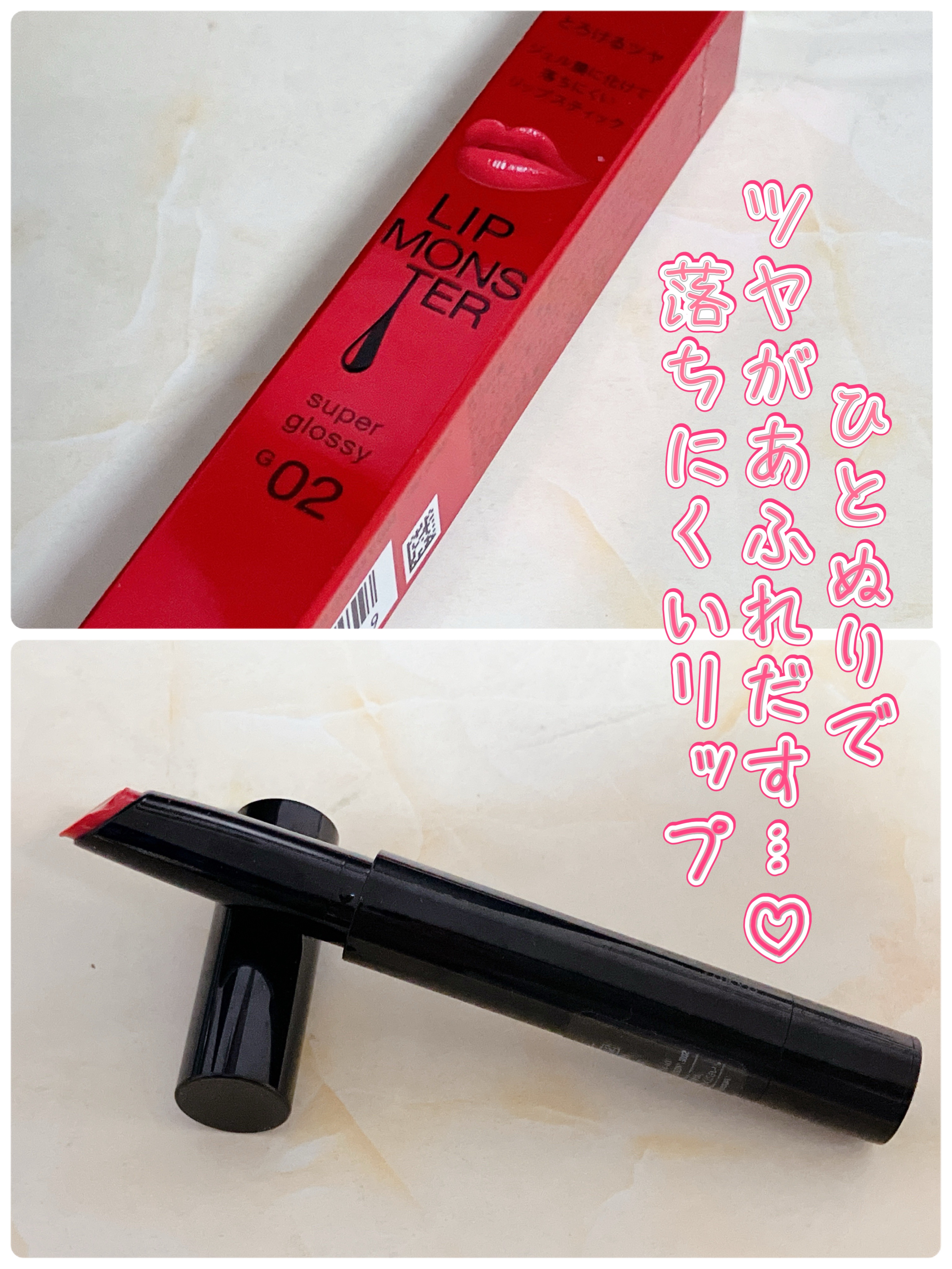 ツヤがきれい・細くて塗りやすい・普通のリプモンより潤いが続くのが良い 02の色味は厚く塗ってしまうと、可愛くなり過ぎるので、少しずつ調整して塗るととっても良いです◎