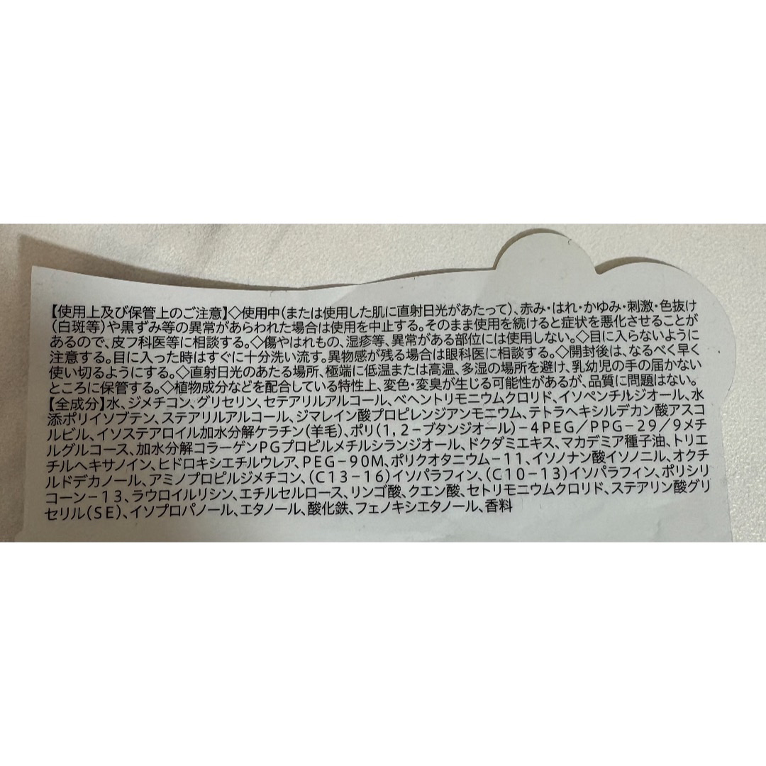- 水、ジメチコン、グリセリン、セテアリルアルコール、ベヘントリモニウムクロリド、イソペンチルジオール、水添ポリイソブテン、ステアリルアルコール、ジマレイン酸プロピレンジアンモニウム、テトラヘキシルデカン酸アスコルビル、イソステアロイル加水分解ケラチン(羊毛)、ポリ(1,2-ブタンジオール)-4PEG/PPG-29/9メチルグルコース、加水分解コラーゲンPGプロピルメチルシランジオール、ドクダミエキス、マカデミア種子油、トリエチルヘキサノイン、ヒドロキシエチルウレア、PEG-90M、ポリクオタニウム-11、イソノナン酸イソノニル、オクチルドデカノール、アミノプロピルジメチコン、(C13-16)イソパラフィン、(C10-13)イソパラフィン、ポリシリコーン-13、ラウロイルリシン、エチルセルロース、リンゴ酸、クエン酸、セトリモニウムクロリド、ステアリン酸グリセリル(SE)、イソプロパノール、エタノール、酸化鉄、フェノキシエタノール、香料