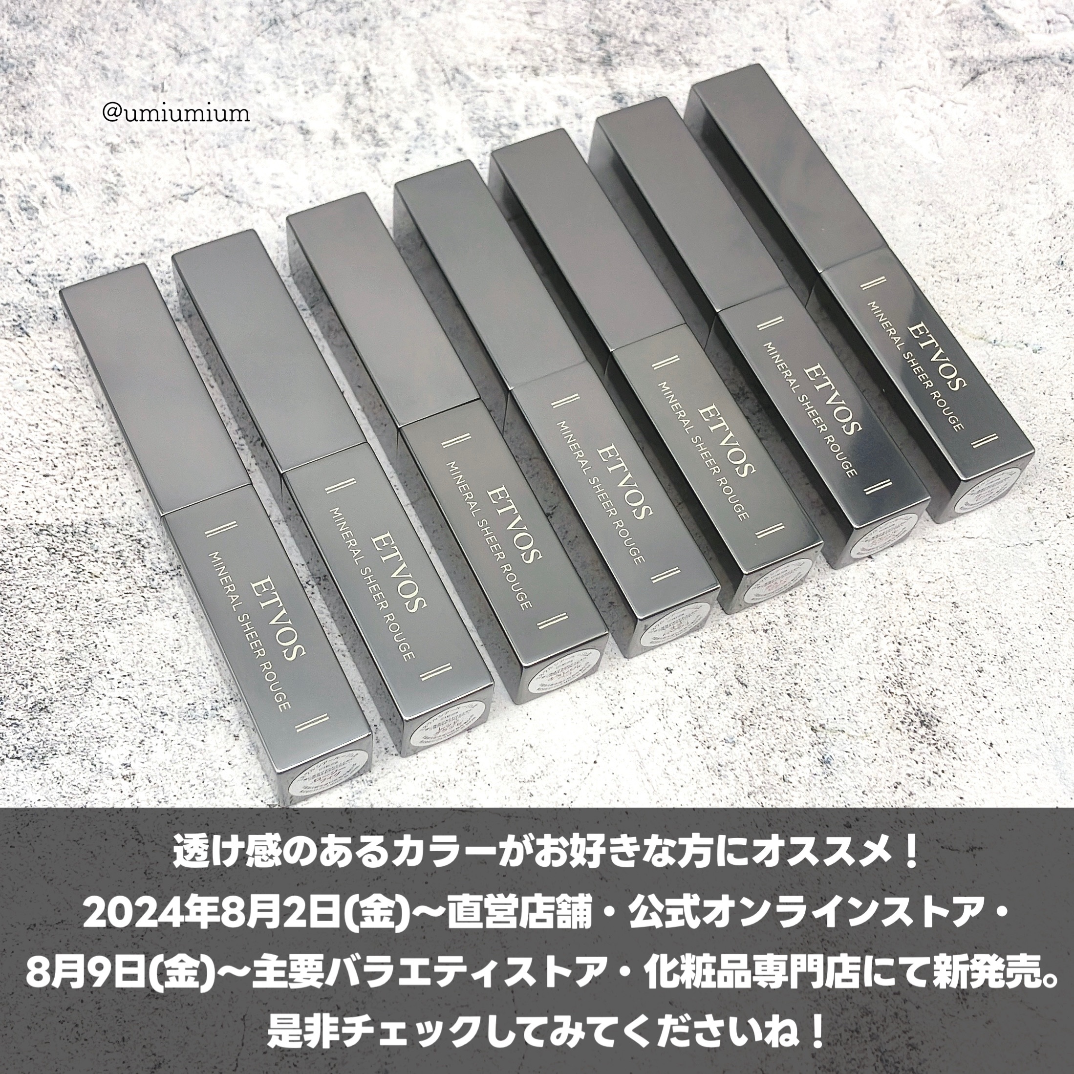 10年の時を経て進化!ETVOS新美容液リップ全色レビュー💄✨ETVOSミネラルシアールージュ定番5色・限定2色各¥3,520(税込)こんにちは!うみかです!いつも♡📎フォローありがとうございます😊本日はエトヴォスの2024年秋コスメからリニューアルした新ミネラルシアールージュを全色レビューしていきます。エトヴォス様よりいただきました!エトヴォスの美容液リップがなんと10年の時を経て進化🫢✨美容成分を閉じ込めたしなやかな極薄ベールがくちびるにフィット。うるおいとツヤ感をプラスしてくれるんです。血色感を与えてくれるシアーな発色。それでいてむっちりとした仕上がりで乾燥しにくく感じました!ラインナップはこちら💁♀️まろやかで明るいミルキーな発色のミルキーシアーと深みのあるシェードのビターな発色のビターシアーの2種類の色味のタイプから選べます!ロージーフィグ(ビターシアー):くすみのない鮮やかさのある青みローズピンク。レッドグラッセ(ビターシアー):じゅわっと血色感のあるビターシアーなレディレッド。オランジェペコ(ビターシアー):ほんのりブラウンを効かせたビターシアーなオレンジ。ラテベージュ(ミルキーシアー):ぬくもりを感じさせるミルキーシアーなオレンジベージュ。ボストンピンク(ミルキーシアー):あたたかみのあるミルキーシアーなコーラルピンク。ミエールベージュ(ミルキーシアー)※限定色:こっくりとしたイエローがアクセントのミルキーシアーなウォームオレンジ。ガーリーピンク(ミルキーシアー)※限定色:青みのあるミルキーシアーなラベンダーピンク。ティッシュオフした感じは結構色残りいい✨ご飯食べたら落ちてしまうけれど禿げるような落ち方はせずに綺麗だったので良し!これ私的に大事なポイントです。透け感のあるカラーがお好きな方にオススメ。普段使いしやすいなあと思いました◎(某バズリップが好きな方はお好きな感じする…👾)明るめカラーが得意なブルベ夏の私のお気に入りカラーはボストンピンクとガーリーピンク🩷2024年8月2日(金)~直営店舗・公式オンラインストア・8月9日(金)~主要バラエティストア・化粧品専門店にて新発売!是非チェックしてみてくださいね✨限定色はお早めに🙏気になっている方のご参考に少しでもなりますと幸いです!その他Instagram投稿はこちらから!@umiumium7777ここまでお読みいただきありがとうございました😊@etvos.jp#gifted#etvos#エトヴォス#ミネラルシアールージュ#etvos新作#新作コスメ#新作コスメ2024#バズコスメ#バズりコスメ#バズリップ#リップ#シアーリップ#エトヴォス_リップ#リップスティック#全色レビュー#ミネラルコスメ#保湿リップ#透明感爆上げメイク