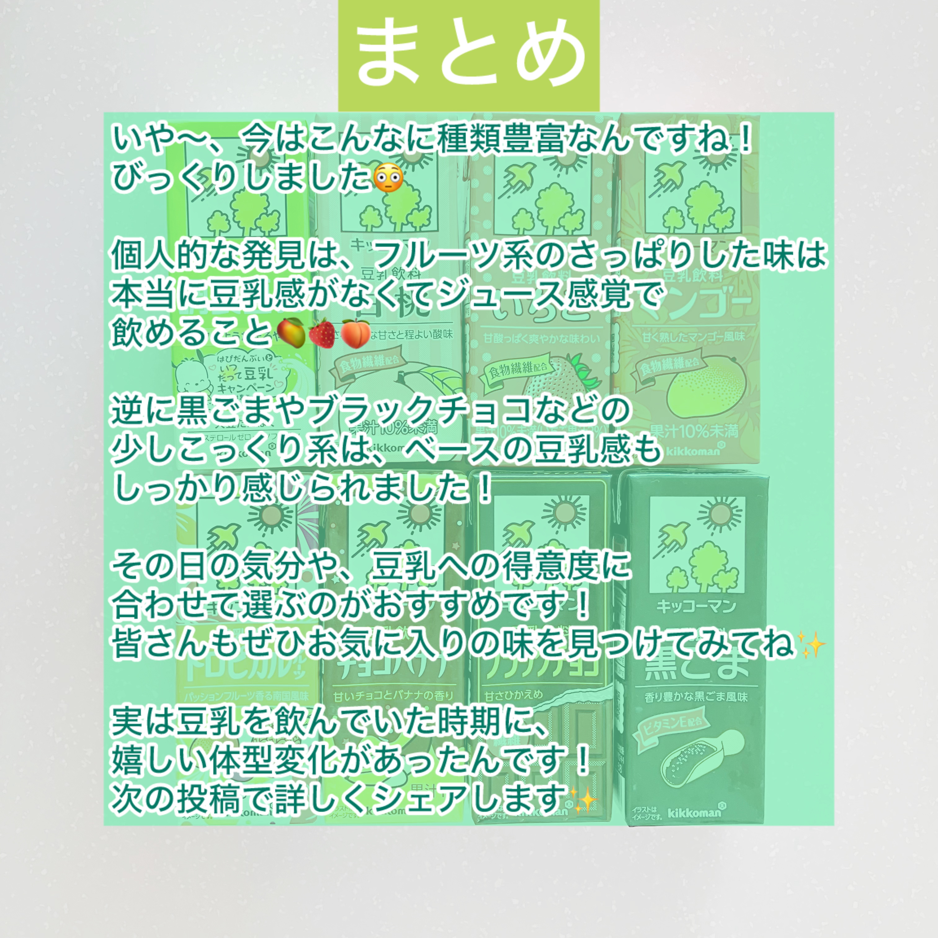 【🌟正直レビュー🌟】キッコーマン豆乳8種類を徹底比較!あなたはどれが好き?🫘✼••┈┈••✼••┈┈••✼••┈┈••✼••┈┈••✼こんにちは!今回はスーパーやコンビニでおなじみ、キッコーマンの豆乳を8種類飲み比べしてみました🥛✨定番から「え、こんな味まで!?」っていう初挑戦の味まで、色々入手したので正直レビューしていきます!豆乳好きさんも苦手さんも必見です🙌✼••┈┈••✼••┈┈••✼••┈┈••✼••┈┈••✼【豆乳の味レビュー】※甘さレベルは5段階評価(MAX5)です🟢調製豆乳味:大豆の風味がちょうどよく抑えられてて、ほんのり優しい甘さ。無調整より断然飲みやすい!おすすめ:牛乳代わりにコーヒーや紅茶に入れるとマイルドで◎甘さレベル:1🖤ブラックチョコ味:ブラックチョコっていうより、甘さ控えめの大人なココアって感じ☕️豆乳の独特な後味はなし!おすすめ:チョコ食べたいけどダイエット中のヘルシーおやつに最適🙆♀️特徴:食物繊維配合✨甘さレベル:2🍑白桃味:さわやかな甘さと程よい酸味!これ、もはや桃ジュース🍑豆乳感ゼロ!特徴:食物繊維配合✨甘さレベル:3🍓いちご味:いちごの甘酸っぱさが爽やか!豆乳苦手な人でもゴクゴク飲める🍓特徴:食物繊維配合✨甘さレベル:3🥭マンゴー味:熟したマンゴーの濃厚な甘さ!いい意味で豆乳っぽくなくてさっぱり飲める🥭特徴:食物繊維配合✨甘さレベル:3🍍トロピカルフルーツ味:南国感あふれる味!酸味が効いてて後味すっきり🌴豆乳感ないから夏にもぴったり!甘さレベル:2🍌チョコバナナ味:まさに屋台のチョコバナナをそのままジュースにした再現度の高さ!間違いない美味しさ🍫🍌甘さレベル:3🎱黒ごま味:一口目は調製豆乳!からの、後から追いかけてくる黒ごまの風味がすごい!でもすっと消えるからくどくない◎おすすめ:豆乳好きでちょっとアクセントが欲しい時に👍特徴:ビタミンE配合✨甘さレベル:1✼••┈┈••✼••┈┈••✼••┈┈••✼••┈┈••✼【まとめ】いや〜、今はこんなに種類豊富なんですね!びっくりしました😳個人的な発見は、フルーツ系のさっぱりした味は本当に豆乳感がなくてジュース感覚で飲めること🥭🍓🍑逆に黒ごまやブラックチョコなどの少しこっくり系は、ベースの豆乳感もしっかり感じられました!その日の気分や、豆乳への得意度に合わせて選ぶのがおすすめです!皆さんもぜひお気に入りの味を見つけてみてね✨実は豆乳を飲んでいた時期に、嬉しい体型変化があったんです!次の投稿で詳しくシェアします✨#キッコーマン#豆乳#ソイミルク#飲み比べ#正直レビュー#ダイエット#美容ドリンク#ヘルシー#おうちカフェ#リピ買い#バズりコスメ#美肌レシピ#インナービューティー