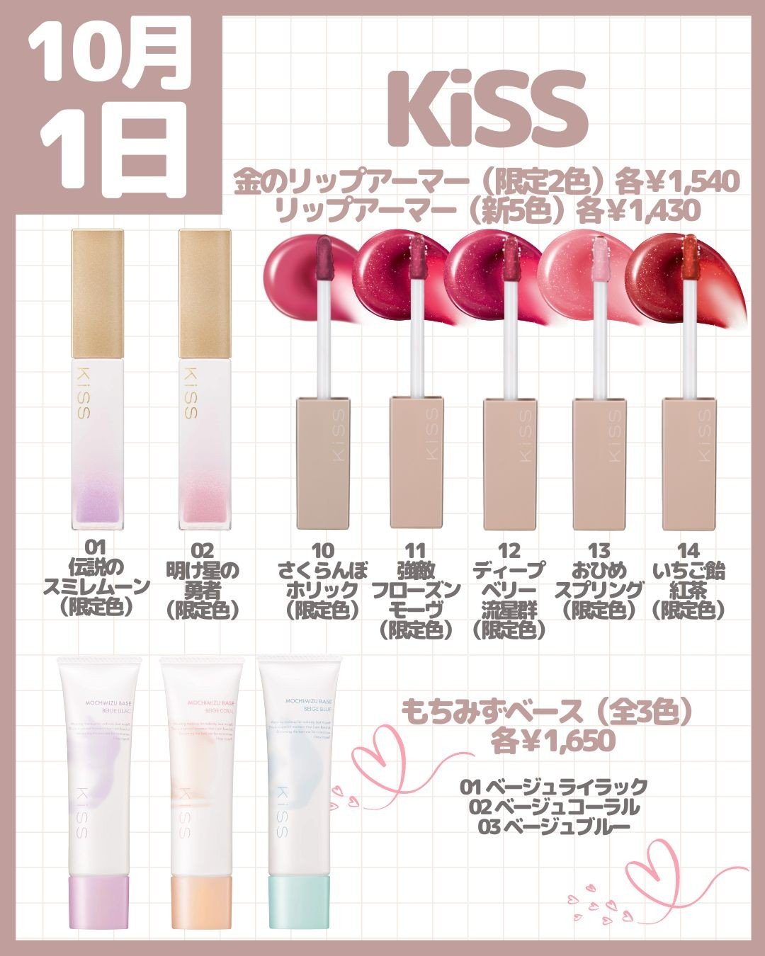 2024年冬コスメ発売日カレンダー【10月/第1弾】10月1日(火)【修正箇所】リップアーマーは限定色ではなく5色ともすべて定番新色になります!こんにちは!kumasakuです🐻@ckumacom▲過去の投稿はここからチェック♡2024年冬コスメ【10月発売】の「コスメカレンダー」を複数回にわけて紹介していきます!保存して欲しい新作コスメを見逃さないように🐻【コスメカレンダー】■10月1日(火)発売→#&be(#アンドビー)→#ETUDE(#エチュード)→#KiSS(#キス)→#CipiCipi(#シピシピ)→#D-UP(#ディーアップ)→#bidol(#ビーアイドル)→#PAUL&JOE(#ポールアンドジョー)→#Laundrin(#ランドリン)次回も話題の新作コスメの最新情報などご紹介しますのでお楽しみに!------------------------------------※画像はLIPS様よりお借りしました。#新作コスメ#コスメカレンダー#コスメ情報#コスメ紹介#デパコス#プチプラ#プチプラコスメ#ドラコス#バズ#バズコスメ#バズりコスメ#新作#新色#限定色#限定品#冬コスメ#メイクアップ#おすすめ新作#限定#リップ#リップスティック#ティント#シアーリップ#チーク#ブラッシュ#韓国コスメ#リップアーマー#金のリップアーマー#ベースメイク#化粧下地#マスカラ#ちゅるるんグロス#グロス#リップグロス#リップケース#ディフューザー#フレグランス#冬メイク#秋メイク#秋っぽ先取りメイク