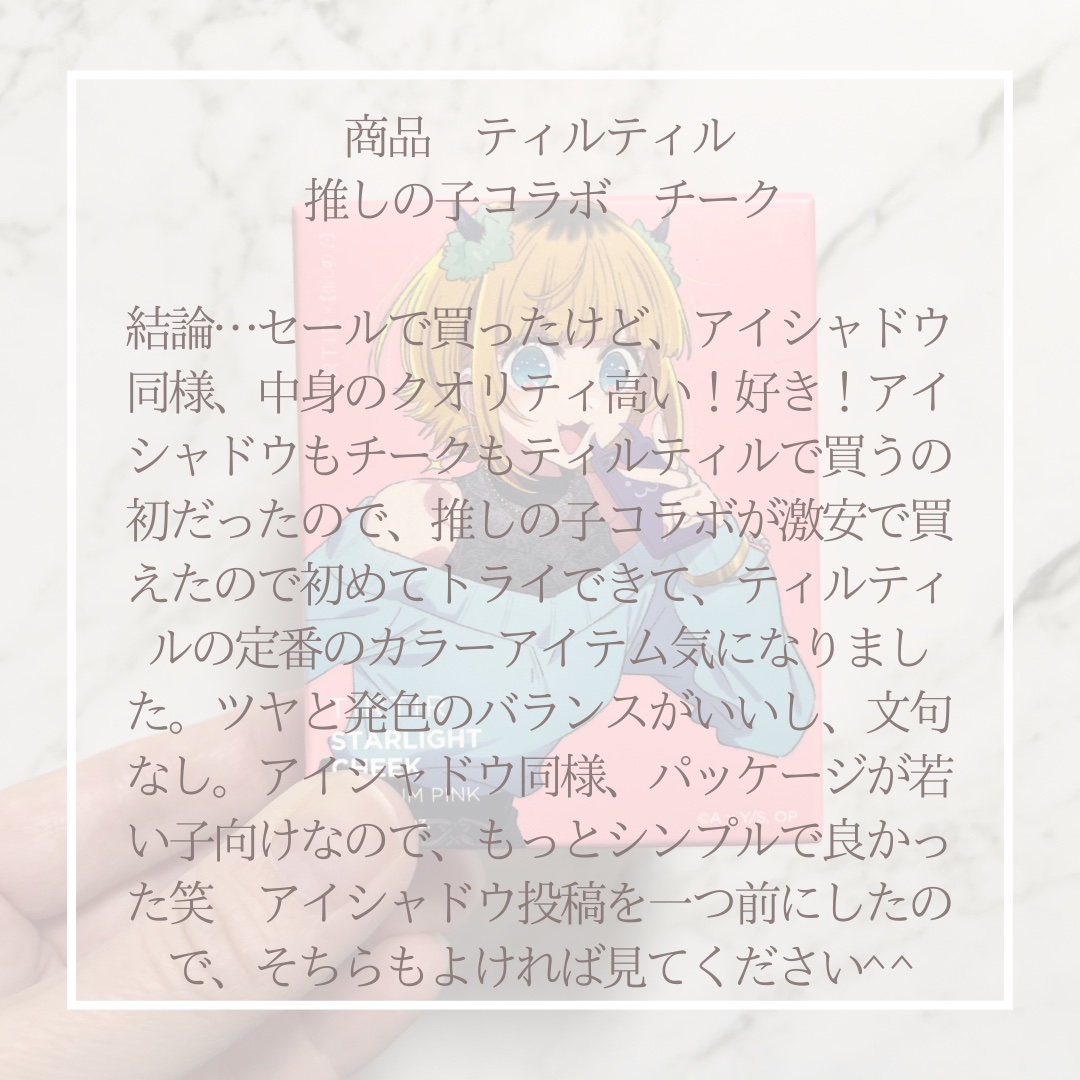流石にかわいすぎるって買うしかないって!TIRTIR ティルティルスターライトチーク02PLUMPINK推しの子とTIRTIRコラボは最強すぎる!良かったところ⭐️•高発色!→やっぱりチークも発色いいものがいいよね! ぱっと顔色が明るくなる!•ブラシ、鏡付き!→何かとあったら便利なので!•透明感爆誕!→透明感とちょっと生意気な美少女感の両方が 手に入る!私はめちゃくちゃ好きなカラー!•パケ優勝!→これもうパケだけで十分価値ある!推しの子とTIRTIRのコラボ!絶対人気が出ると思います!欲しい方はお早めがいいかも!?気になった方はぜひチェックしてみてください!#TIRTIR#ティルティル#スターライトチーク#推しの子#コラボコスメ#新作コスメ#夏のお供紹介します#チーク