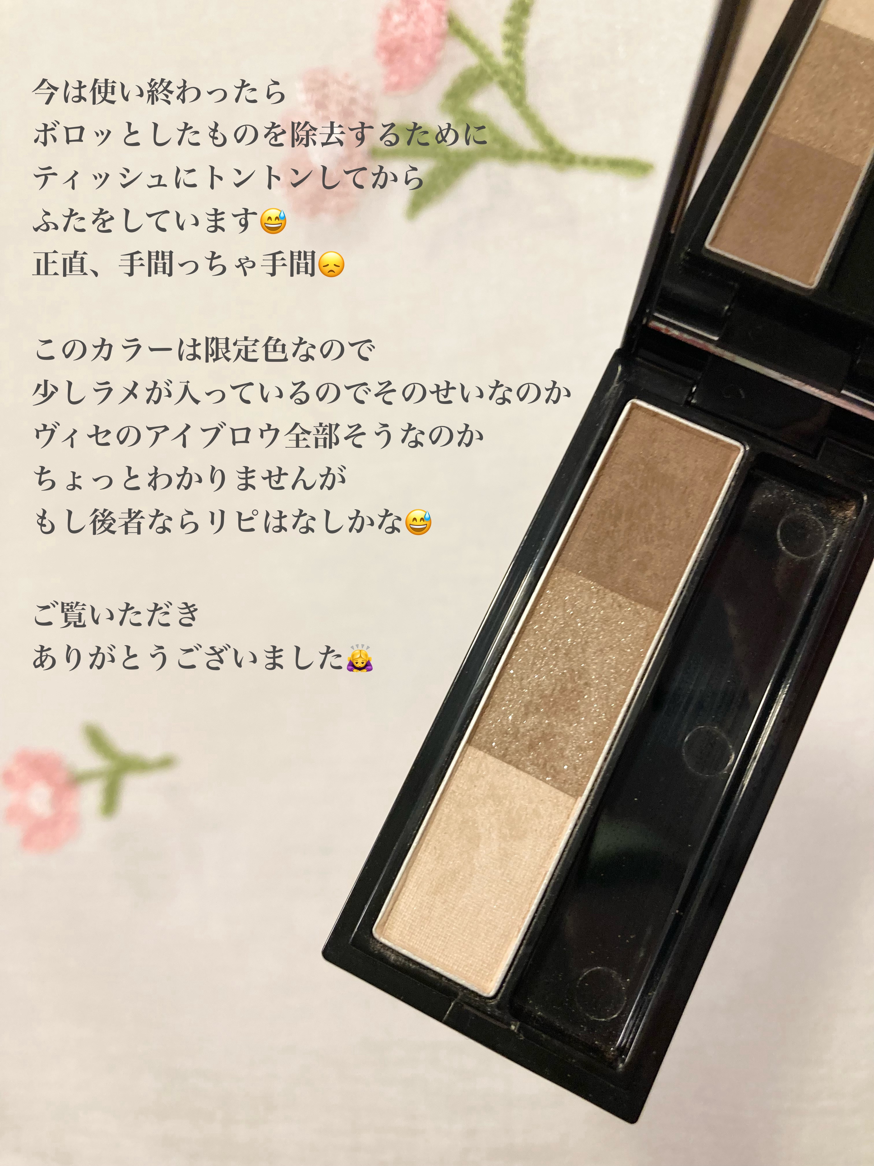ーーーーーーーーーViséeヴィセリシェアイブロウパウダーBR-9ホワイトアッシュブラウン限定税込1,210円ーーーーーーーーーこちらのアイブロウ色はとっっても好きなんですがちょっと気になることが出てきたのでレビューします🙇♀️色や描きやすさはとても好きです🥰でも少しブラシに取るだけでボロッとしたアイブロウが出てきてそれを取ろうとするとまたボロッとして😇そのままふたをして過ごすと次開けたときに中が粉粉しているんですよね、、気にならない人はスルーして大丈夫です💦でも個人的に少しでもきれいに使っていきたい派なのでボロッとしたものが出てくることも、中が粉粉することも気になってしょうがない😂今まで使ってきたアイブロウパウダーはこんなにボロボロしなかったので余計に気になってしまったのかも…色はかわいいです😅今は使い終わったらボロッとしたものを除去するためにティッシュにトントンしてからふたをしています😅正直、手間っちゃ手間😞このカラーは限定色なので少しラメが入っているのでそのせいなのかヴィセのアイブロウ全部そうなのかちょっとわかりませんがもし後者ならリピはなしかな😅#ヴィセ#ヴィセリシェアイブロウパウダー#アイブロウ#眉#正直レビュー