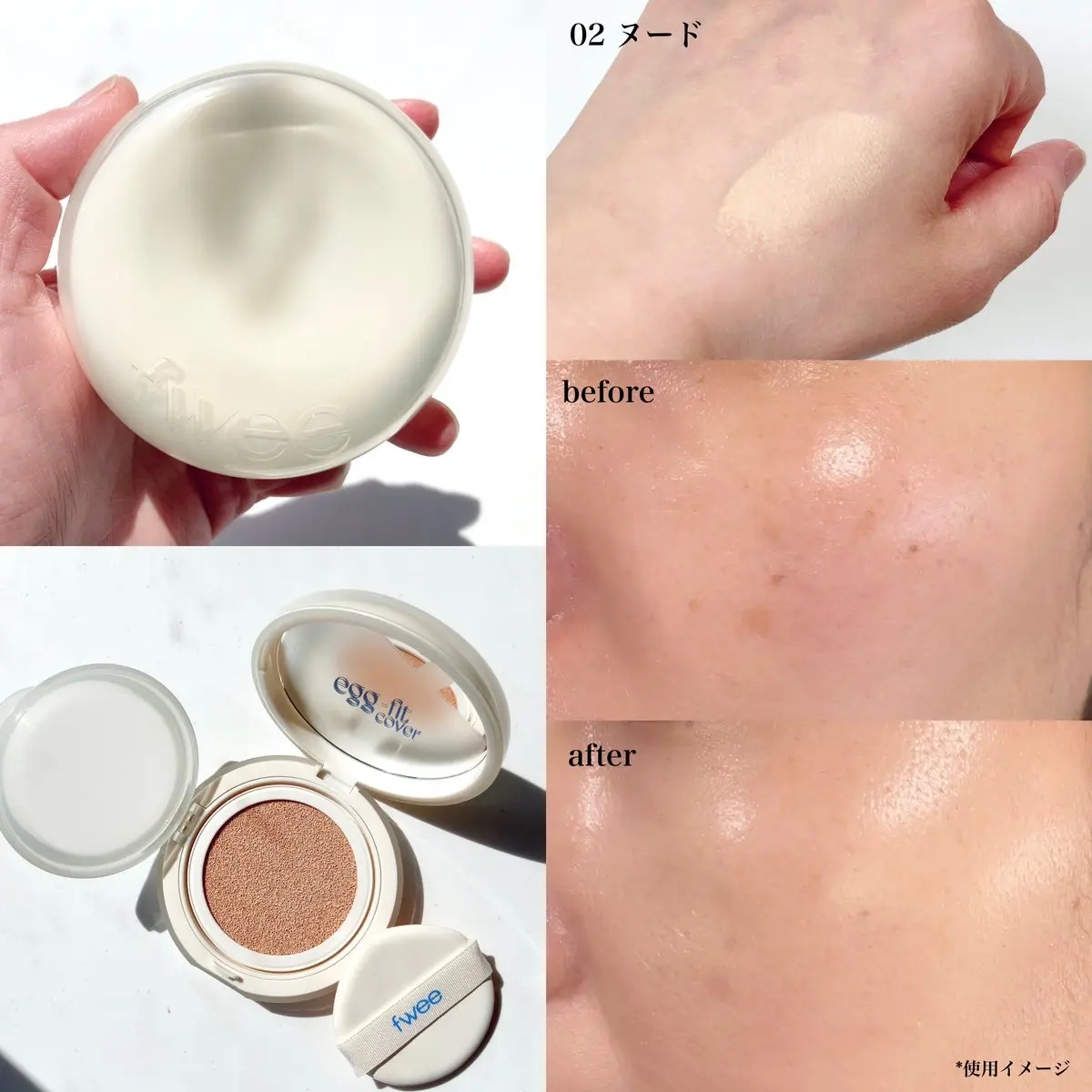 #PR@fwee_makeup_jp🥚むき卵肌カバークッション🥚/✔️クッションエッグフィットカバーカバー力高めなのに厚塗り感なくて、肌が軽い✨高密着で崩れにくいところもおすすめポイント◎使い勝手のいいクッションファンデでベースメイク時短出来てカバー力も崩れにくさも兼ね備えてるの良すぎる!