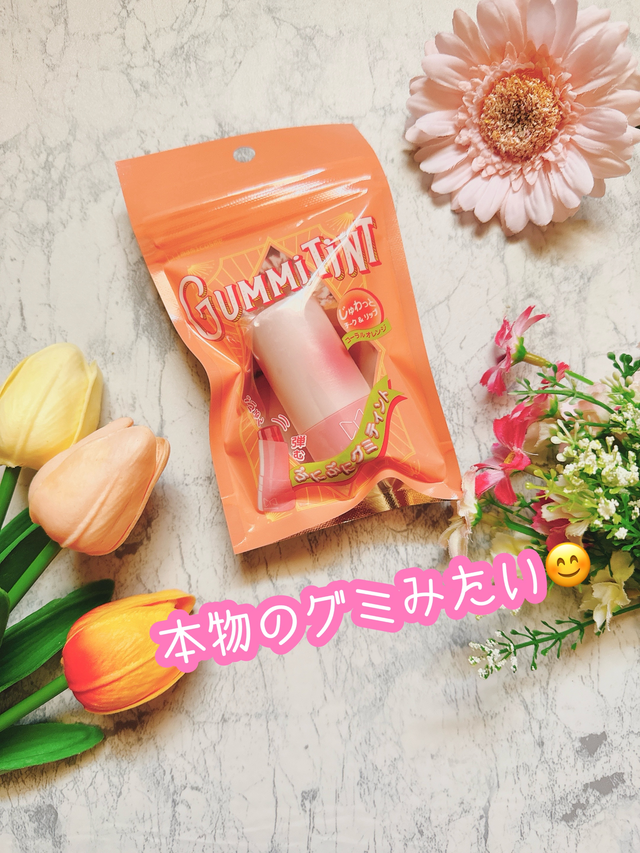 気分はずむ新感触‼️まるでグミのような、新感触のチーク&リップ「グミティント」です。パッケージから本物のグミみたいにおいしそうですね♡グミみたいにぷるぷるしてるんです。本物のグミみたい‼️発色は自然なオレンジです。色を濃くしたいのなら、やさし...