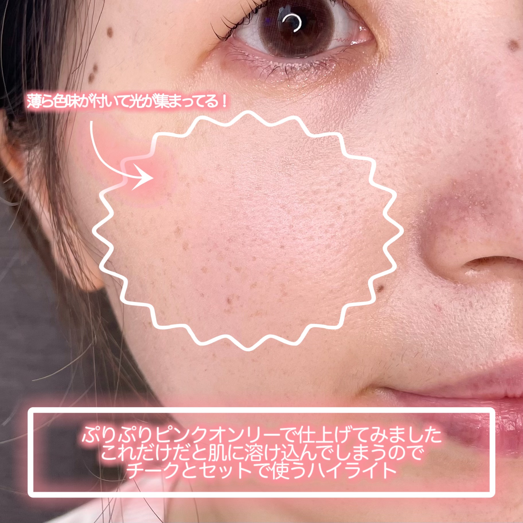 これはめちゃくちゃ可愛いプチプラハイライトでした!✨ 03はめっっちゃかわいかった! 頬の上に付けるだけで可愛さ倍増💕💕🥺 プリっとするから若見えするし、肌綺麗にみえる☺️ このくらいのピンク強めなハイライトって意外に無いからこれは無くなってもリピ確定(˙▿˙)☝