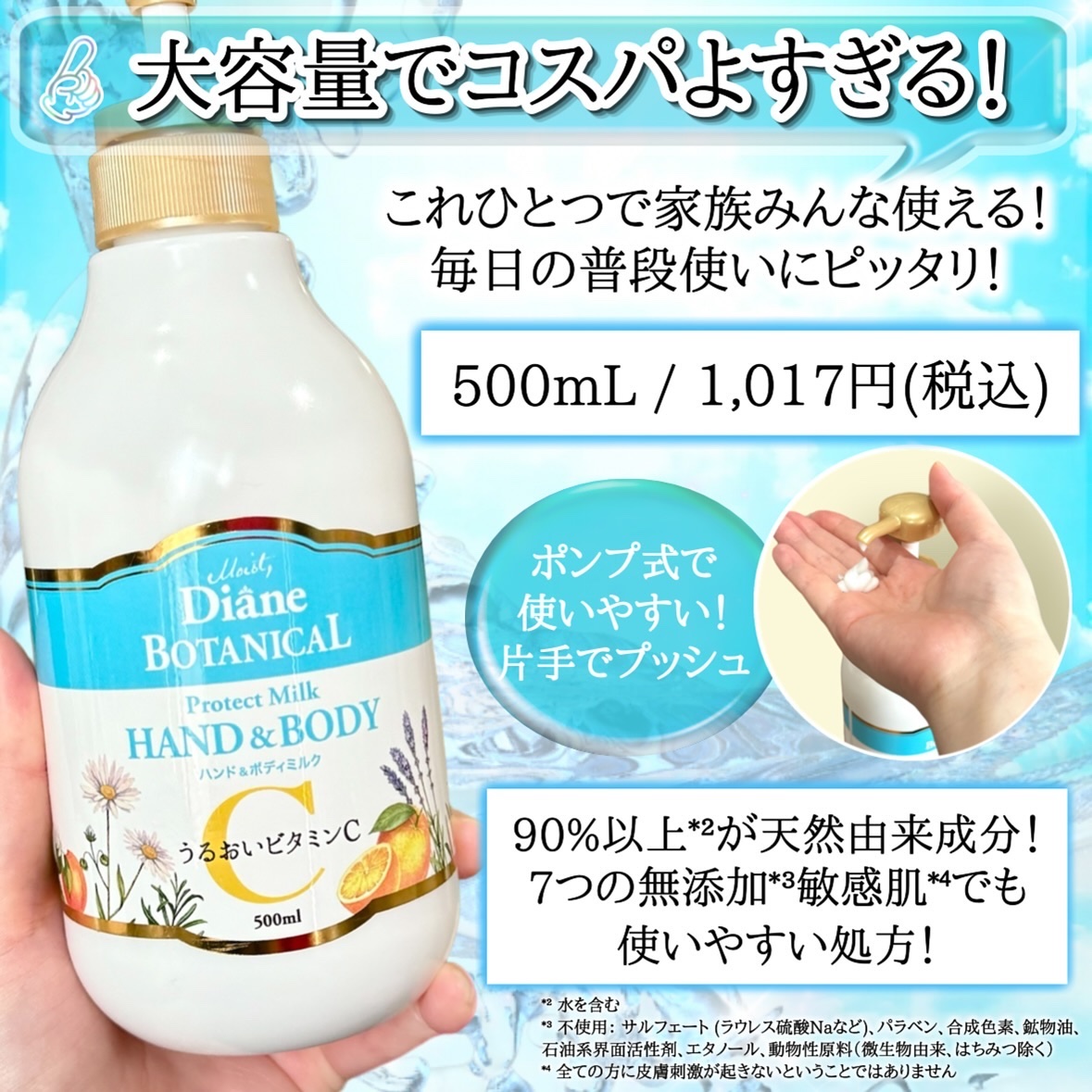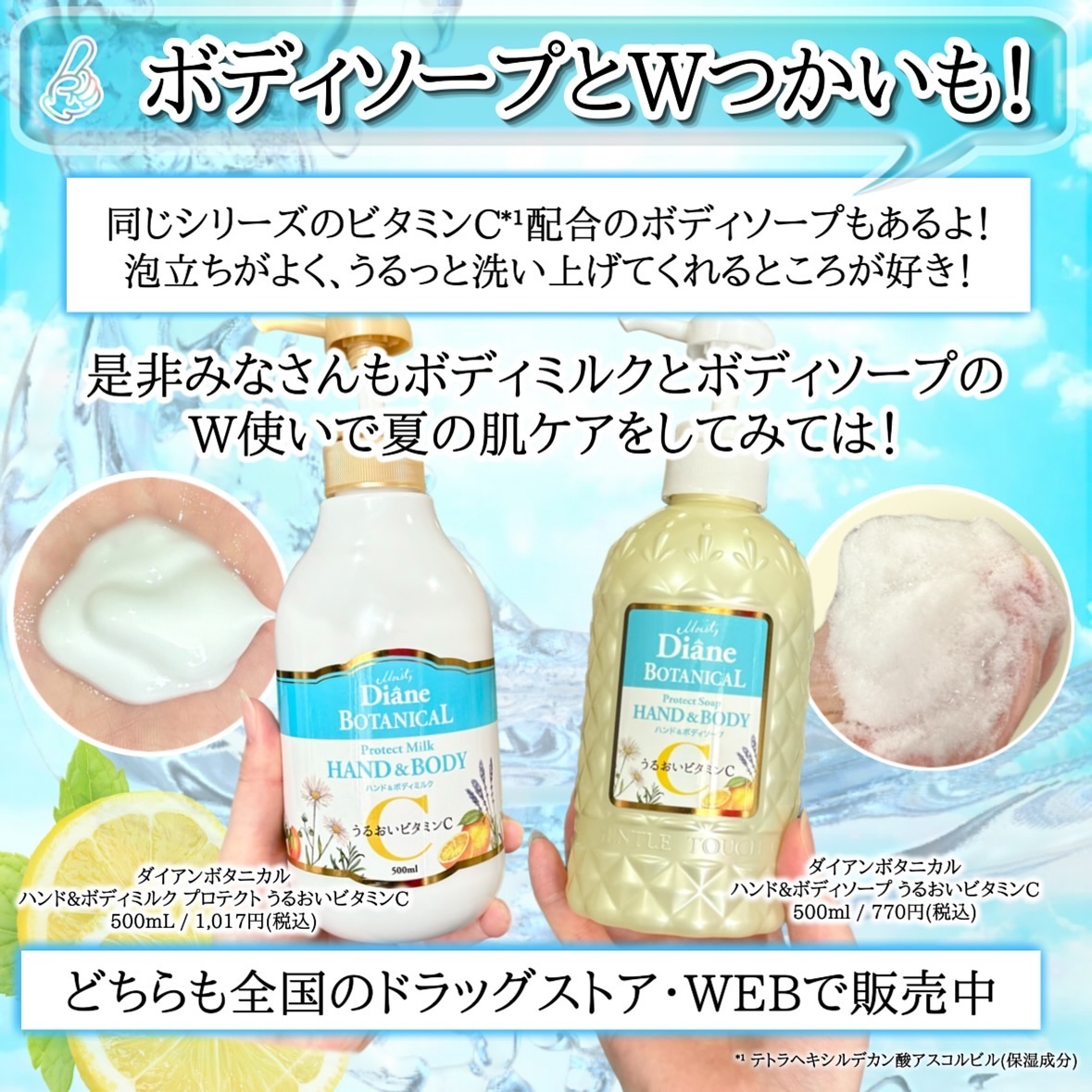 『LDKtheBeauty』でA評価👑コスパ+機能性よすぎるDianeBOTANICAL(ダイアンボタニカル)のハンド&ボディミルクがめっちゃ便利!美意識高い方は夏こそ保湿ケア頑張ってる!!エアコンや紫外線、夏は意外と乾燥しやすいのはご存知!?今の時期、夏の保湿ケアにオススメなのが🍉ダイアンボタニカルの「ハンド&ボディミルクプロテクトうるおいビタミンC」夏はクリームだと重すぎる...そんな方に、このボディミルクはぴったりだと思います♡夏のお肌にパワーチャージ⚡️うるおいビタミンC*¹成分配合で乾燥しがちなお肌を保湿し、明るく透明感のあるみずみずしい肌印象へと導いてくれる☀️夏だから保湿はいいや、、とボディケアサボってるズボラさんにも是非オススメしたい一品!スルスル〜と肌にみずみずしく馴染むミルクタイプでありながらべたつきを感じず、うるおいを与えてくれるところが魅力的!!さっぱり爽やかなシトラスサボンの香りで夏もすっきりボディケアができる🌻ほのかに香る柑橘系がたまらないのです...🍋ポンプ式で使いやすいし、90%以上*²が天然由来成分!敏感肌*³でも使いやすい処方だからひとつ置いておけば家族みんな使える🙆🏻♀️私の旦那さんも、簡単に使えてベタつかないからとしっかり愛用してくれています☺️♡家族とシェアでき、毎日の普段使いにピッタリで500mL/1,017円(税込)と大容量でコスパがよすぎるのがありがたすぎる。おしみなくたっぷり使えて、成分も処方も、お値段以上です🙏朝起きた時の保湿と、お風呂上がりの保湿。一日2回の使用がおすすめです✨同じシリーズのビタミンC*¹配合のボディソープもあるよ!泡立ちがよく、うるっと洗い上げてくれるところが好き!シトラス&ホワイトティーの香りがバスルームいっぱいに広がり満たされる...是非みなさんもボディミルクとボディソープのW使いで夏の肌ケアを楽しんでみては🌻◾︎どちらも全国のドラッグストア・WEBで販売中◾︎———————————DianeBOTANICAL(ダイアンボタニカル)⚫︎ハンド&ボディミルクプロテクトうるおいビタミンC500mL/1,017円(税込)⚫︎ハンド&ボディソープうるおいビタミンC500ml/770円(税込)———————————*¹テトラヘキシルデカン酸アスコルビル(保湿成分)*²水を含む*³全ての方に皮膚刺激が起きないということではありません#PR#dianebotanical#ダイアンボタニカル#ボディミルク#ボディクリーム#ビタミンCボディミルク#ボディソープ#ビタミンCボディソープ#ビタミンC