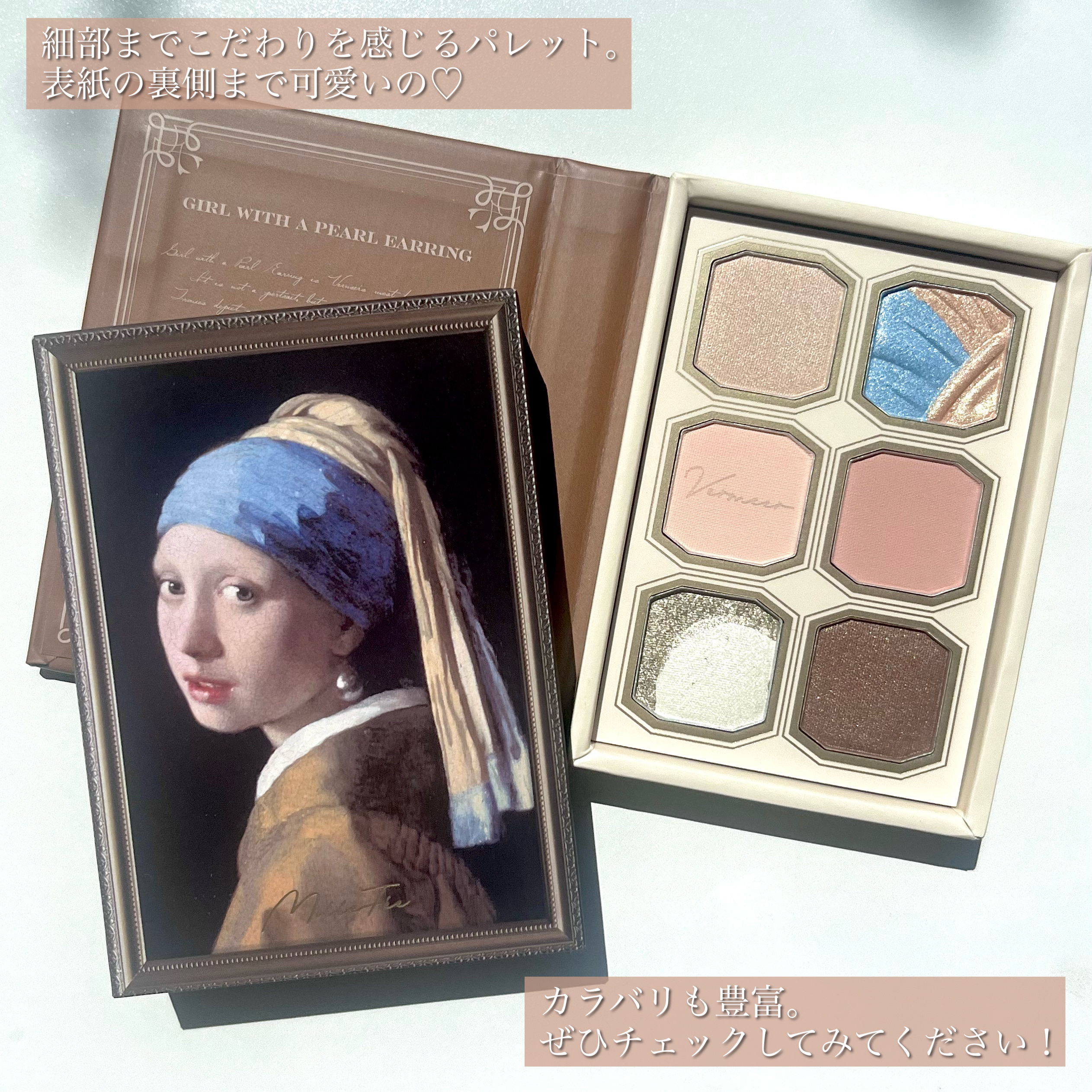 柔らかい色味と真珠やドレープのデザインが印象的なパレット。 絵画の世界観が忠実に表現されてて眼福🥹 特に左上のパール見てほしい!この光り方、まさに真珠じゃない!?💫 使いやすいかつオシャレなパレット。 絵画アイシャドウパレットはカラバリも豊富なのでお気に入りの色味が見つかるはず!