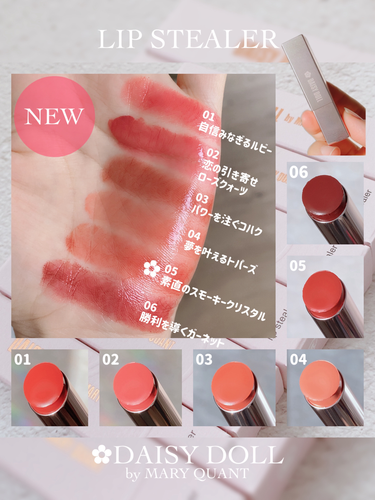 デイジードールの新作リップがすっごく可愛い! しかも名前もリップスティーラーっていって泥棒も盗みたくなるような宝石リップを意味してるの。 わたしの推しは02 恋の引き寄せローズクォーツ。薄塗りならすっぴんでも似合っちゃう自然さで2~3度かさねるとキチンと感でてきてお出かけ仕様に。 なじみがよくてオイリーすぎないツヤも綺麗で仕上がりもつけ心地も気に入ってます🔅