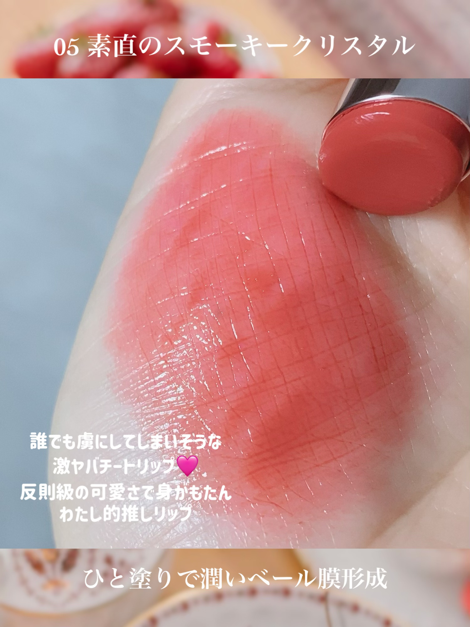 ティントでツヤも発色もキープ! つけたてがずーっと続く生溶けリップ! デリケートな唇にうれしいフリー処方だよ♡ これは下地やケア用のリップなしでもみずみずしくて皮むけしないから、楽ちん😁👍