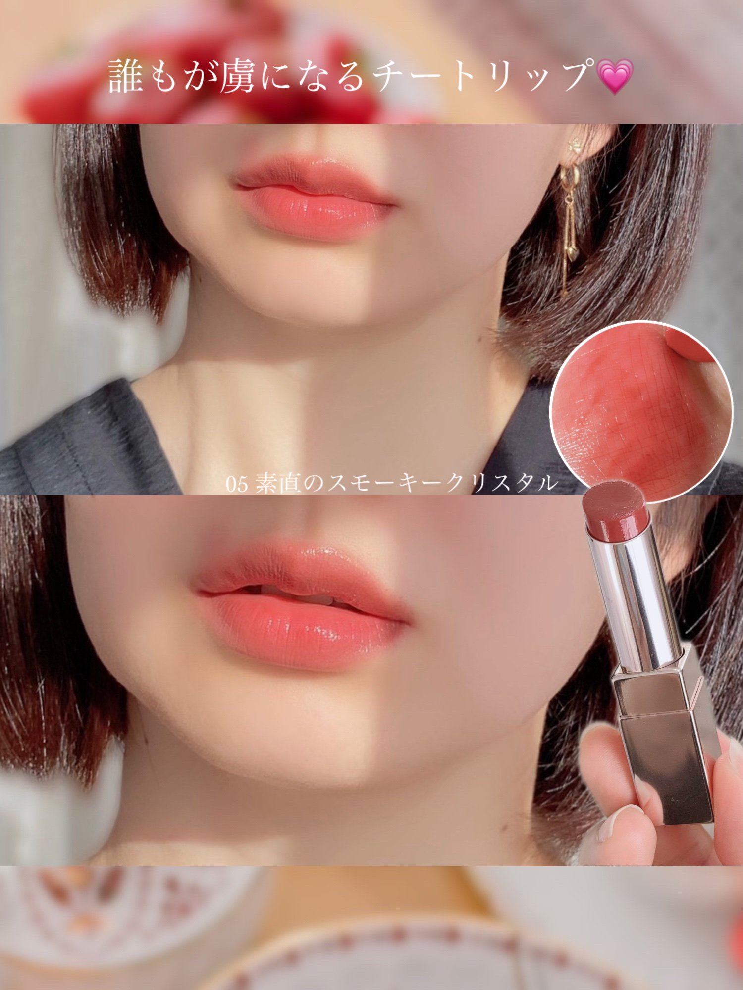 ご令嬢生溶けリップ💋 唇に載せた瞬間になめらかにひろがり宝石のようなツヤを与えるリップスティック 02恋の引き寄せローズクォーツ🩷 透け感のある鼓膜ピンク 生っぽい質感にほのかな品が漂う絶妙カラー 05素直のスモーキークリスタル🧡 気品を感じる柔らかなコーラルピンク 甘すぎず肌になじむような抜け感カラー
