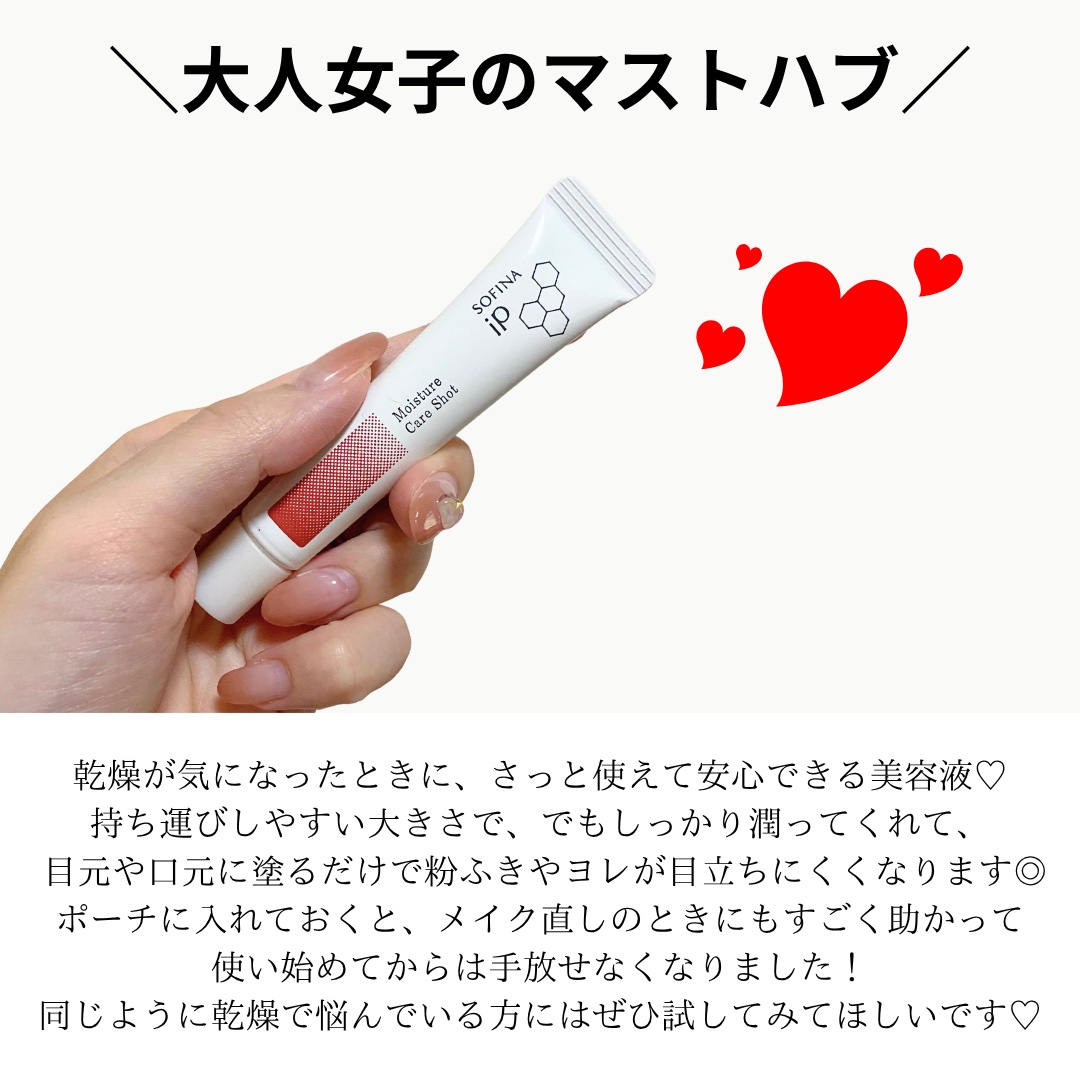 SOFINAiPソフィーナiPうるおい高密着ショット10g¥1,980LIPSで購入しました日中の目もと口もとの乾燥に♡しっとり肌に馴染みます♡伸び ★★★★⭐︎保湿力★★★★⭐︎コスパ★★★★⭐︎#SOFINA#乾燥対策#乾燥シーズンの肌管理#保湿ケア#シワ
