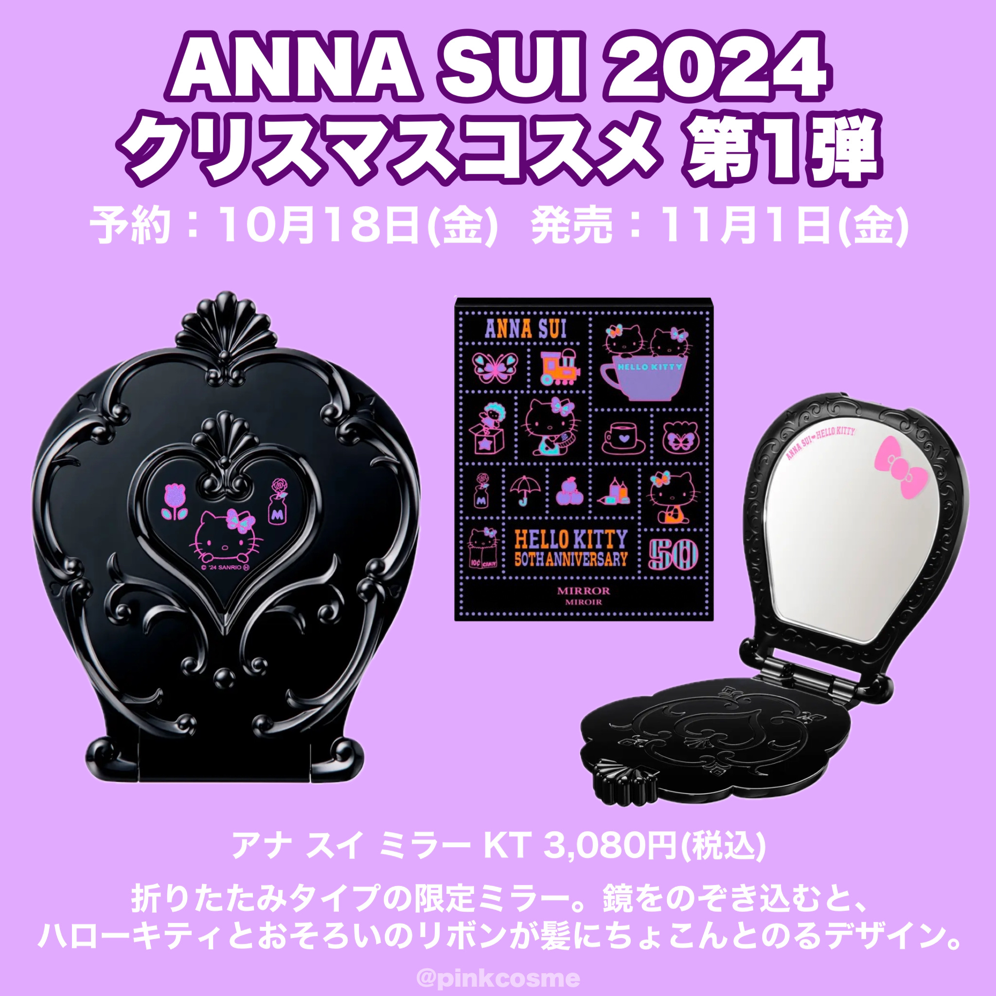 【速報!クリスマスコスメ2024】ANNASUIクリスマスコスメ第1弾と第2弾まとめて紹介💁♀️アナスイはのクリスマスコスメ第1弾は50周年を迎えるハローキティとコラボ!アナスイの世界観に染まったキティちゃんがたっぷり堪能できるコスメが可愛い♡キティちゃん好き、ネコ好きさんは必見!第2弾はフレグランストリートメントバームを薔薇の指輪にしちゃった!?【第1弾】予約開始:10月18日(金)発売:11月1日(金)◻️リップスティックKT300/400限定2種各¥3,850(税込)◻️ネイルカラー&ハンドクリームキットKT01/02限定2種各¥3,630(税込)◻️ルースフェイスパウダー(ミニ)200/300限定2種各¥5,500(税込)◻️アナスイミラーKT限定¥3,080(税込)【第2】予約開始:11月1日(金)発売:11月15日(金)◻️トリートメントバーム01/02/03限定3種各¥2,420(税込)┈┈┈┈┈┈┈┈┈┈┈┈┈┈┈┈ANNASUIさん…やってくれましたね…キティちゃんの形したリップ、もったいなくて使えないほど可愛い!鏡は持ち歩きに便利な折りたたみタイプ!トリートメントバームも指輪になってるの可愛いよね♡これは争奪戦になりそうな予感…!是非チェックしてね!────────────少しでも参考になったらフォロー、♡、クリップよろしくお願いします!────────────#ANNASUI#アナスイ#anna_sui#リップスティックKT#ネイルカラー&ハンドクリームキットKT#ルースフェイスパウダー#ミラーKT#トリートメントバーム#ホリデー2024#ホリデーコスメ#クリスマスコフレ#クリスマスコスメ#クリスマスコスメ2024