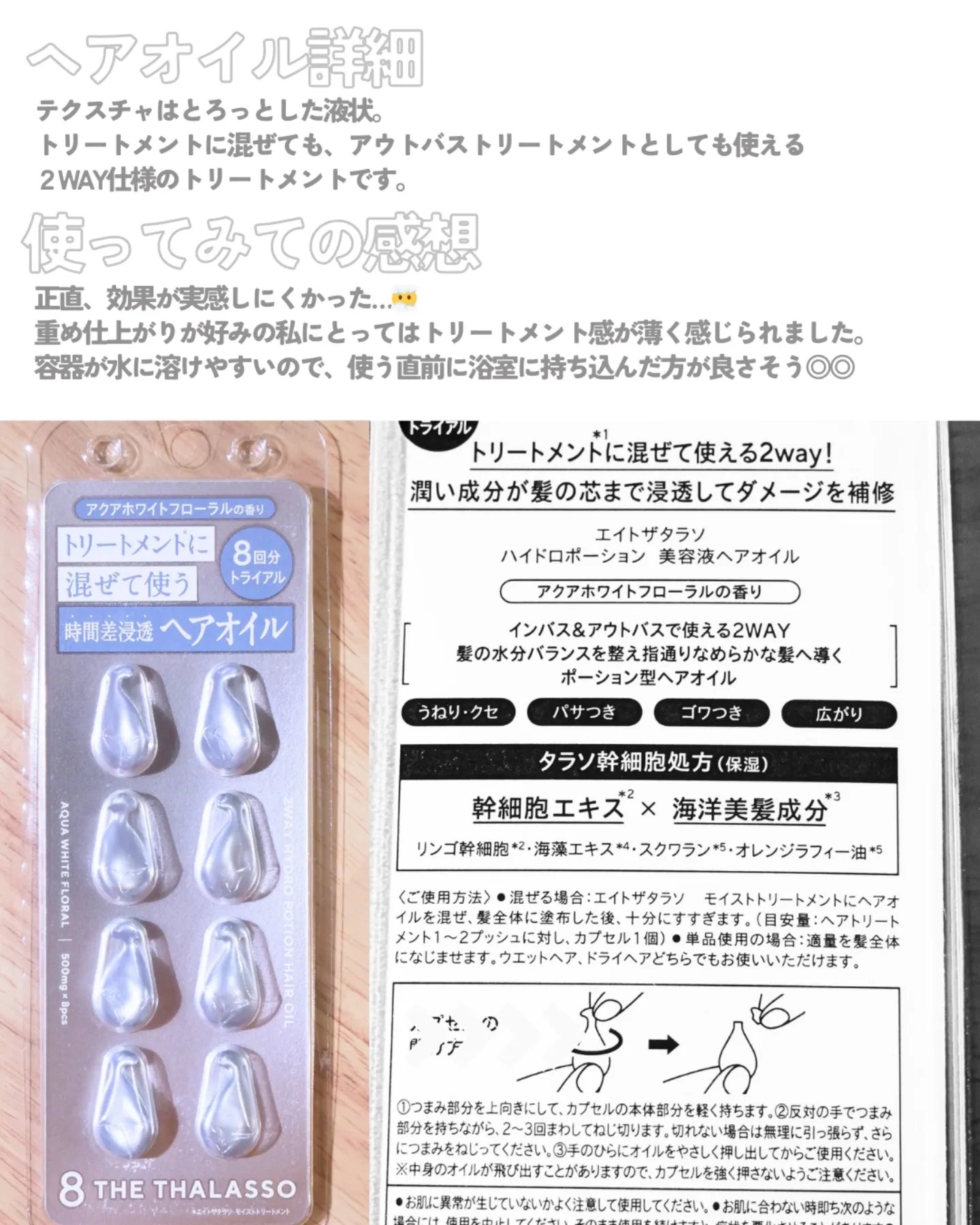 エイトザタラソは猫っ毛に向いていると聞いていたので頂けて嬉しかったです。そして噂通り、猫っ毛の私には良かったです✌ こういうものって大体匂いが本当にキンモクセイか…?って思うことがあるのですがこれはかなりキンモクセイの香りそのまんまです 個人的にはヘアオイルが一番感動しました🙆 付けはじめはしっとりしますが次の日には保湿はされつつもサラサラで猫っ毛には重たくならずツヤ髪に…!