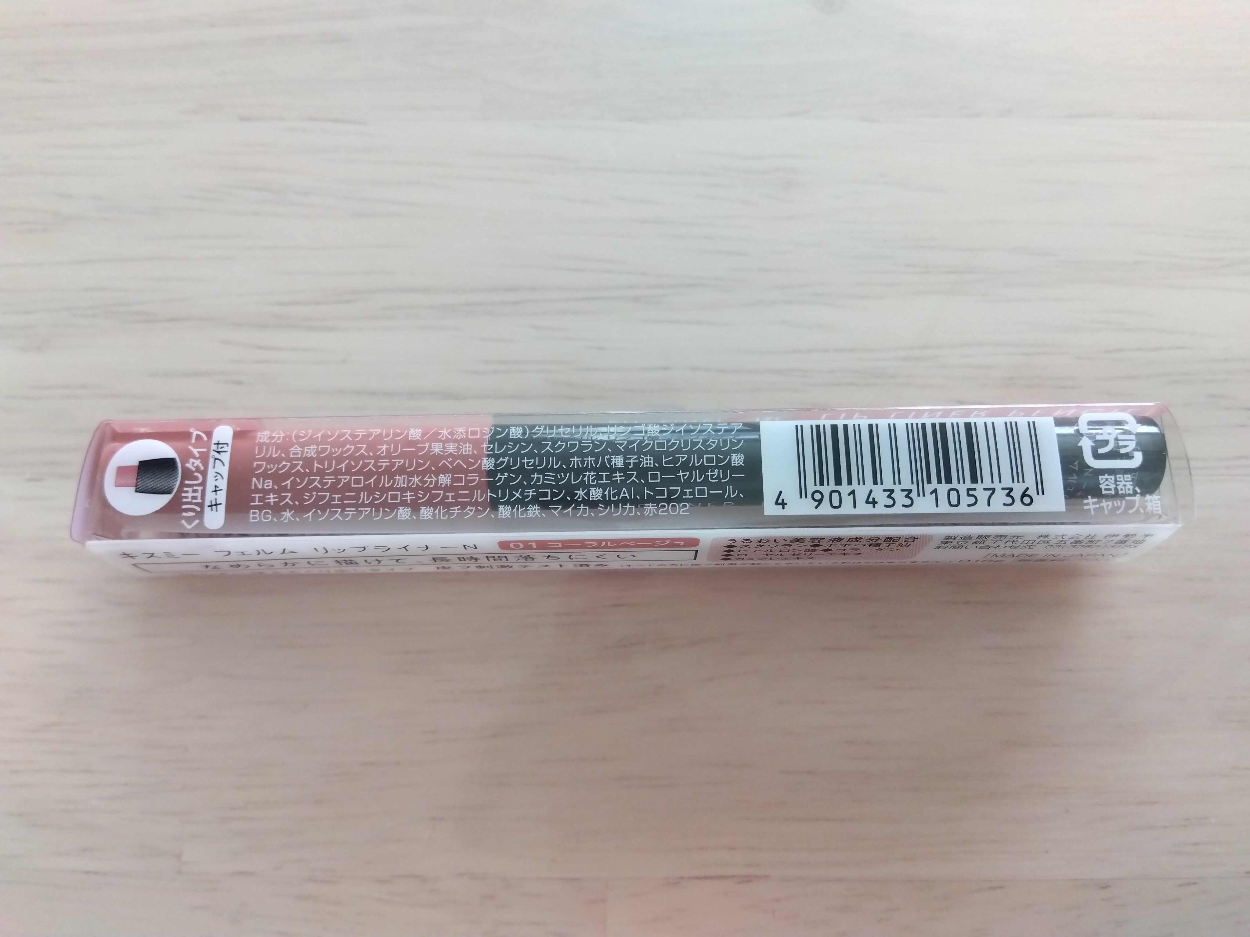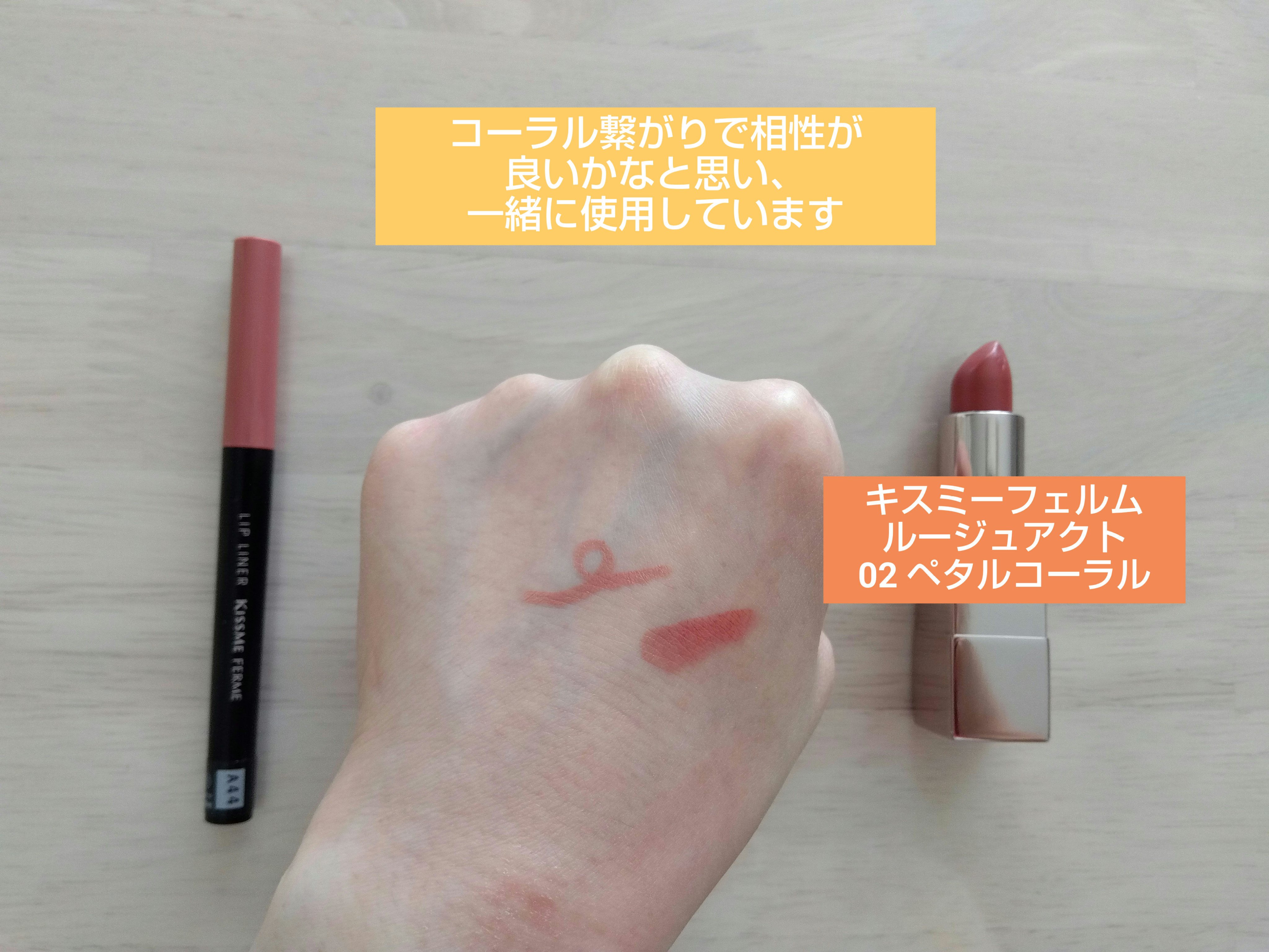 【キスミーフェルム リップライナーN】 01コーラルベージュ ¥770中顔面短縮効果を狙って購入しました。03ピーチベージュと迷いましたが、テスターを手の甲に塗ってみると01コーラルベージュの方がピンク寄りの色に見えたのでこちらを購...