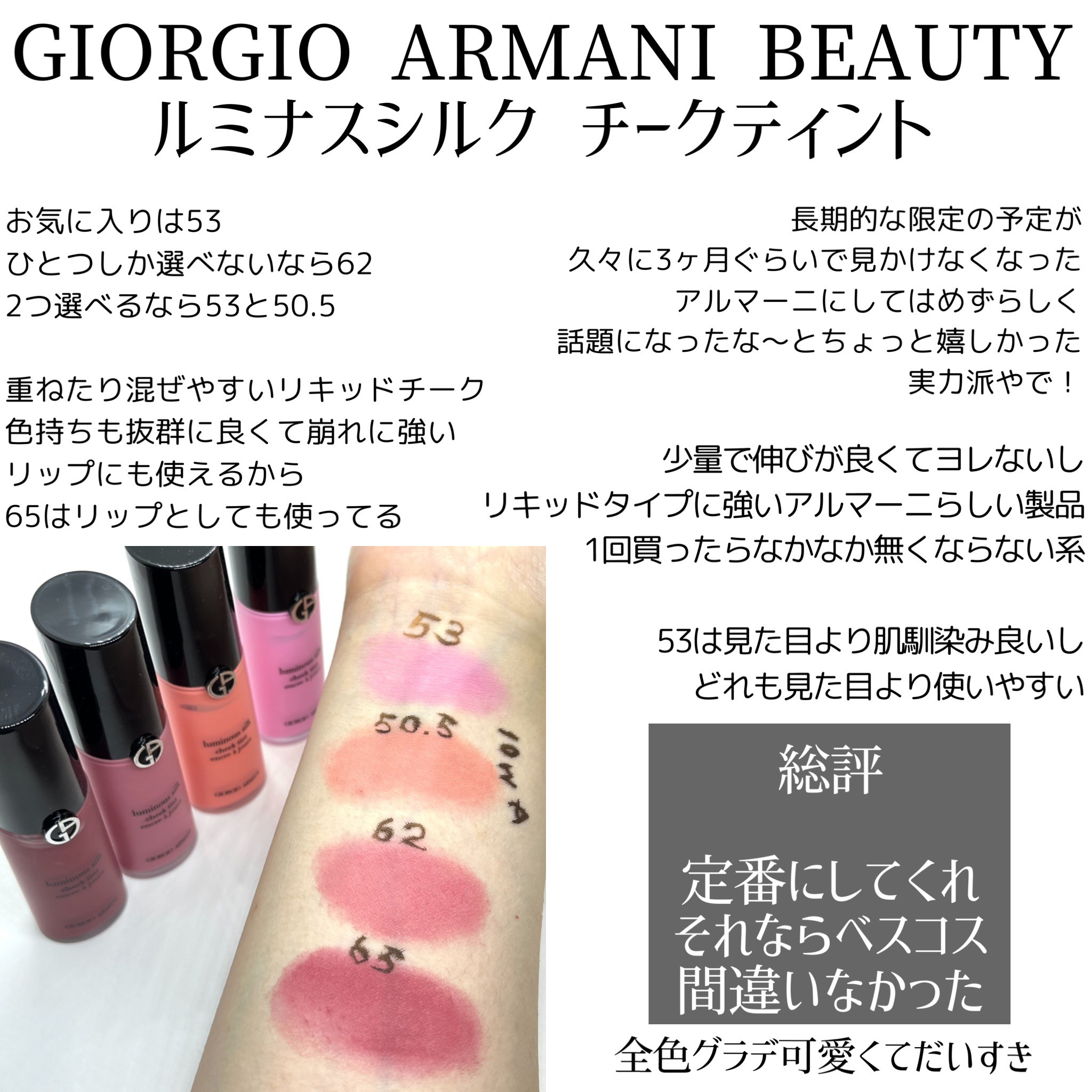 2024年マイベスコスメイクアップ製品、発売年度縛り編画像にも感想書いてますが、スウォッチやメイク画像などの投稿のリンクと一緒に良かった点を詳しく書いてるので気になった人はそちらも是非見てみてください⭐️←これが各アイテムごとのベスコス発売年度縛りなしは別で投稿したいスキンケア編もまとめたいけど個別投稿できてないのでそれを先に…【アイシャドウ】▼GUERLAINオンブルジェ458オーラグロウ春に出た限定。2024年1番使ったアイシャドウ。普通にこういう系統のアイシャドウが好きでもあるから余計にお気に入り。定番とはまた違った良さで手持ちのオンブルジェ限定なら1番好き。詳しくは過去の投稿参照↓https://lipscosme.com/posts/6190653⭐️PRADABEAUTYダイメンションズマルチエフェクトアイシャドウ🩶02プロフュージョン💛これは定番なので実質アイシャドウのベスコスはプラダ🎉出番は04のほうが多いけど、これがきっかけでプラダ買うようになったし、定番の配色が他にはない差し色がどれも素敵。スウォッチ↓https://lipscosme.com/posts/6791151メイク例↓https://lipscosme.com/posts/7188179シルバーラメはギラギラしてるけど、SHISEIDOのKATANAFUDEで上の細長いブラックを交互にブラシにとってラインにするとラメライナーみたいになるからこの使い方がお気に入り▼RMKシンクロマティックアイシャドウパレットEX-08セドナサンセット夏に出た限定。暖色系に振り切ってると見せかけてラメ入りの色はグレージュだったり赤系オレンジとイエローはマットっていうオシャレな配色。締め色ないのもポイント高め。暖色系でもかなり使いやすい。スウォッチなど↓https://lipscosme.com/posts/6551018メイク例↓https://lipscosme.com/posts/6977248【リップ】⭐️GUERLAINキスキスビーグロウオイル🎉1番使ったリップで定番。リップならベスコスはこれ大好きアルマーニのグロスもいいけど発売早かったのはこっちで、久々にこういうツヤッとした薄付きのグロスやオイル好きだったのを思い出して懐かしくなった。保湿力もあるし、こういうオイルにしては色持ちがあまりにも良い。2色持ってるけど選ぶなら458🩷458ローズポップグロウ🌹https://lipscosme.com/posts/6460988💜809https://lipscosme.com/posts/6619024ただ、横向けにしてると時々中身漏れてることあるのが残念。どうにかならないかなぁ。▼ジョルジオアルマーニビューティプリズマグラス定番と限定があるけどすごい好きでよく使ってる。ゲランのリップオイルがポーチに入れてて中身漏れてたことがあってから使用頻度、持ち運び率も増えた。phでピンクになったりしないところが逆に良い。薄付きではあるけどオレンジやブラウン系、ベージュもピンクにならない。定番なら07https://lipscosme.com/posts/6785115限定なら09https://lipscosme.com/posts/6976435刺激感じない程度のプランパー効果やゲランのリップオイルに比べるとツヤ感控えめなので使いやすいこれはもう趣味です【チーク】⭐️ジョルジオアルマーニビューティルミナスシルクチークティントしれっと在庫復活してたので2024年ベスコス🎉画像に書いてる通り、1つしか選べないなら62、ふたつ選べるなら53と50.5とちょっと変わってくる。派手そうに見えるけど肌馴染みめちゃくちゃ良い。リキッドでも本当に少量で伸びも良くて色持ち、つけ心地、何もかも文句なし!出番が多いのは圧倒的に53の白っぽいピンク全色スウォッチまとめ↓https://lipscosme.com/posts/7177692▼#アルマーニビューティールミナスシルクグローブラッシュ10インティメート全色定番のパウダーで待望の新色追加!ピンクベージュ!粉質はしっとりしてて、ベージュチークにはめずらしい白っぽいシルバー系の細かいラメ入りがアルマーニらしくて最高に好き!2023年のベスコスはまとめる時間なかったけどこのチークがマイベスコス。ナチュラルめの色展開とても嬉しい。リキッドが話題になってたけどパウダーチークもめちゃくちゃ良いので合わせて使ってること多め10番スウォッチ↓https://lipscosme.com/posts/69302302023年発売の4色まとめ↓https://lipscosme.com/posts/52387331番お気に入りは30と52、使用頻度高いのは51と10【ベースメイク】⭐️#ジョルジオアルマーニビューティデザイナールースパウダー🎉2024年ベスコスひとつ選ぶならこれ!定番新作。成分表記のはじめのほうに水があるめずらしいパウダー。そんなの他に知らない。笑パフでつけた時にパフ濡れてるのかと思うような質感が成り立ってるの、本当にすごい。メンソール系のひんやりではなくて、水っぽさが体感できるすごいパウダー。夏場も崩れにくくて粉っぽくなくて使用感も持ちも良い名品。詳細↓https://lipscosme.com/posts/6450710・パワーファブリック+ロングウェアウェイトレスマットクッション2024年10月発売の新作定番。名前が長い。アルマーニにしてはハイカバーで色も明るめで黄みやピンクさをほぼ感じないところが良い。名前の通り仕上がりはマットでパウダーしたみたいに見えるし崩れにも強い。乾燥も私は気にならないので、長らく