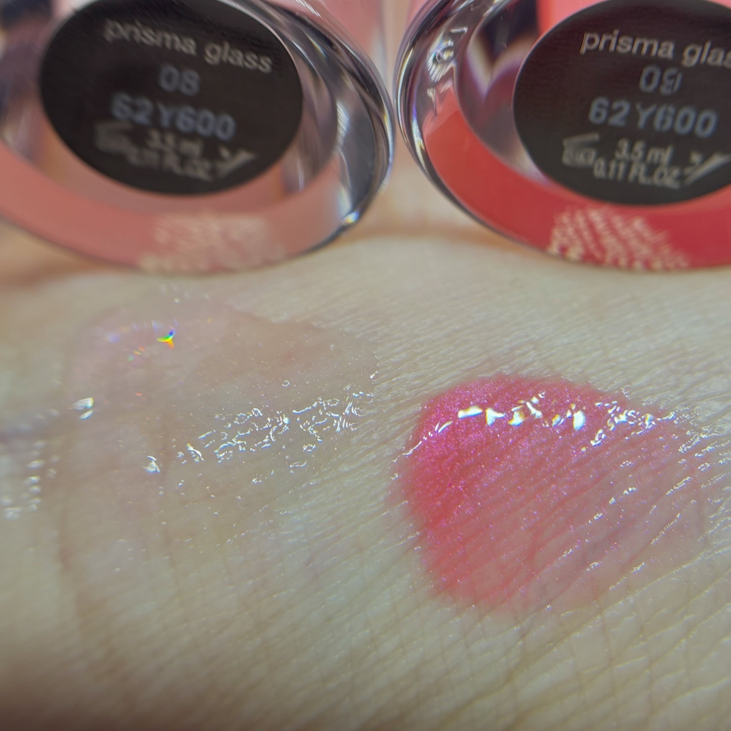 ホリデー限定の2色。プリズマグラス自体が2024年発売の新作です。 08はちょっとだけ白っぽいピンクに色つくけどほぼ透明でピンクラメが入ってる。 このグロス、1本6050円するし量も少なめなんで、あんまり気軽にオススメ!とは言いにくいんですが、色もそんなに濃くなくて透け感綺麗なのと、落ちてきても分かりにくいし、グロスにしては持ちは良い。