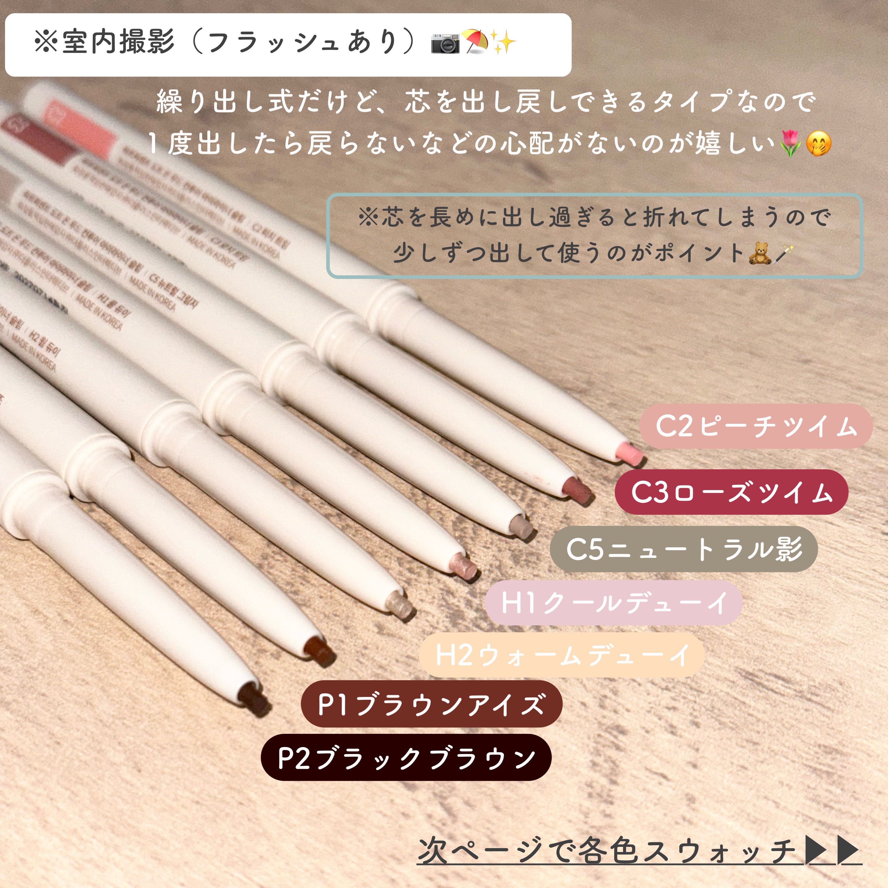 クリーミーな描き心地で力を入れすぎるとぽきっと折れちゃうほど🤭 スルスル描けちゃう! 乾くと滲まず崩れにくい👏 イエベカラーブルベカラーがあるので自分に合った涙袋や影が作れるはず🤭