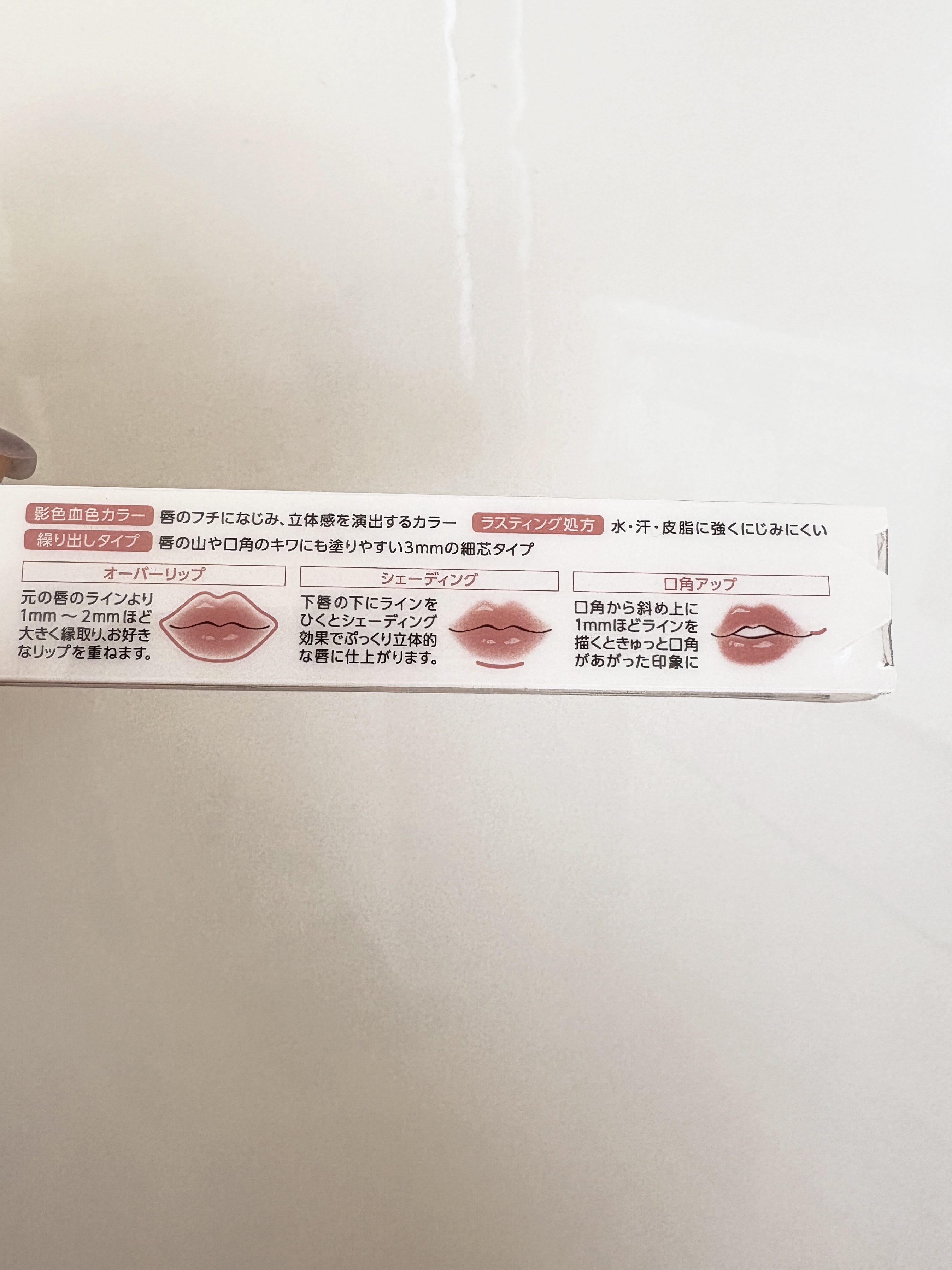 唇が薄めなので、少しボリューム出したいと思って買ってみました!芯が柔らかいからスラスラ塗れて口角も上がって見えるし、これを塗ってからリップつけると立体的な唇になります!発色もちょうどよくて、リップの色に馴染んでくれるのがいい!