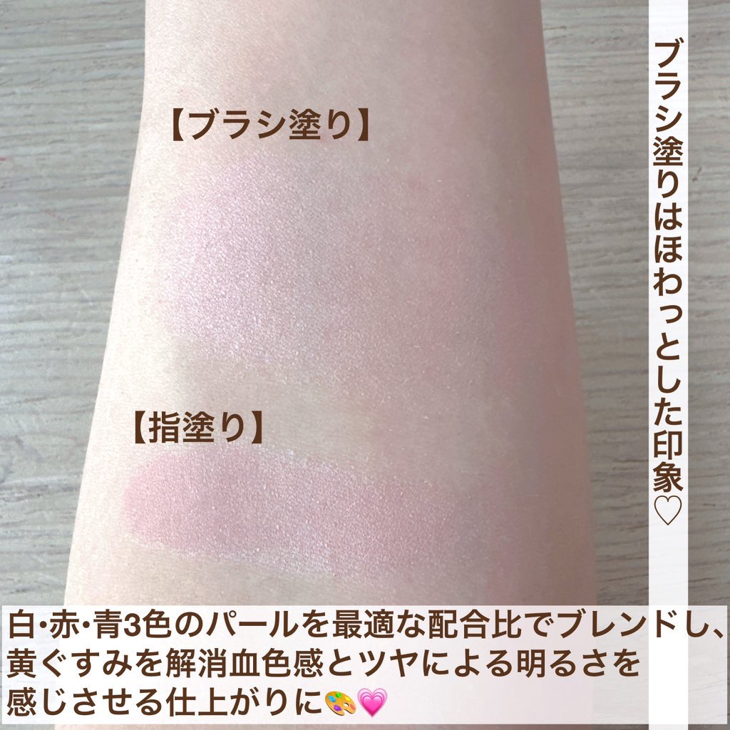- 1. 部分的に塗布しただけで、全方位どこからみても、明るさのある美しい肌をつくる 独自のカラーパール層は、干渉パールと球状粉体を高配合しているため、光を広範囲に反射させることを可能に。 部分的に塗布するだけで、360°どこからみても明るさとツヤを放ちます。 また、透明感を引き出す青の効果を採用、年齢による黄ぐすみを目立ちにくくします※。 ※メイクアップ効果による 2.素肌から反射した光も味方につけた“透ける血色”。肌になじみ、顔全体からあふれるいきいき感。 透過性の高いパールにより素肌まで多くの光を取り込み反射するので、肌と一体化し、肌なじみの良い血色感を実現。 広範囲に塗布することができ、顔全体に血色という光をまとった明るさあふれる仕上がりになります。 3.その他の特長 ・どんな肌にもなじみやすい2色のカラー展開。 ・1日中美しい仕上がりが持続します。