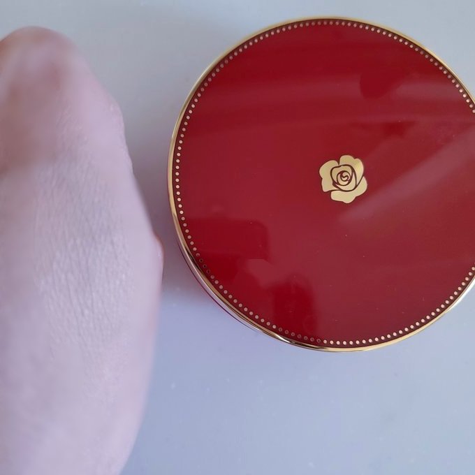 レッドのコンパクトに薔薇のモチーフで、ゴージャスな印象のデザイン✨🌹 持ち運ぶのも楽しみになりそう。 カバー力は高め、だけどナチュラルな仕上がり。 伸びが良くてムラになりにくいテクスチャで、均一にお肌をカバーしやすいです◎ ローズのような香りがします🌹 私は香り付きのものが苦手なので、かなりほんのりなのはありがたい。