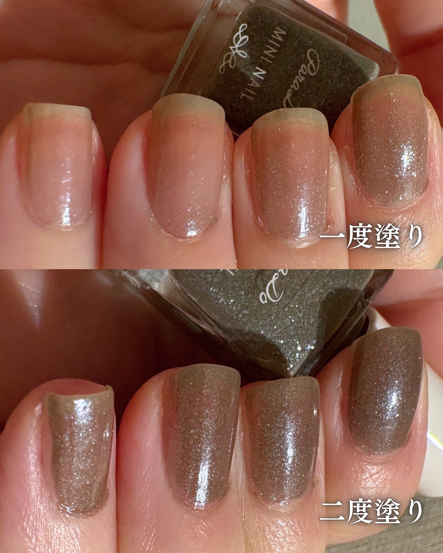 シルバーラメたっぷりのグレージュ。ブラウンネイルをしたいけれど、黄みのあるブラウンは手から浮いてしまう方におすすめしたい秋カラーです。 誰にも似合う落ち着きと上品さがありますが、特にブルベさんに似合うブラウンポリッシュです。 3枚目は親指。ナイトペッパーを重ねてみました。この組み合わせも可愛い。