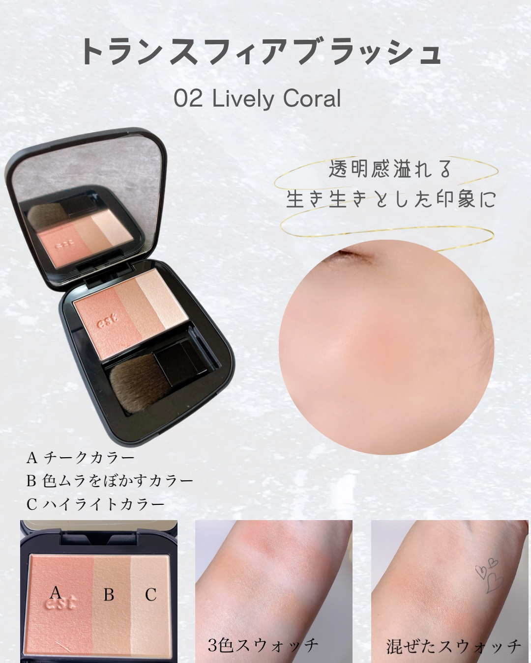 コスメラウンジの企画で、エストさんから商品を提供いただきました。✨新発売✨トランスフィアメイクアップシリーズ//透明感と生命力あふれる美しさを手に入れよう!💖┈┈┈┈┈┈┈┈┈┈🌟トランスフィアアイカラー【商品特徴】▸▸トランスフィアパールが光を反射して、重ねるたびに透明感が増し、明るさが際立ちます。【使用感】左上のカラーが特に優秀で、くすんだ目元もひと塗りで明るく!重ねるとプロ級の立体感あるアイメイクが簡単にできちゃうよ。マジでおすすめ♡🌸トランスフィアブラッシュ【商品特徴】▸▸頬だけでなく肌全体の美しさを引き立てるチーク&ハイライト。【使用感】3色セットで、全部混ぜても良し、色味を変えて楽しむのも良し!肌色に馴染むから失敗しにくいよ♪💄トランスフィアリップスティック【商品特徴】▸▸みずみずしい艶と血色感で、ふっくらとした唇に。【商品特徴】保湿成分配合で一日中乾燥知らず!吐息中の水分に反応してジェル化するオイルが潤いをキープしてくれるんだって。冬の乾燥対策にもバッチリ!┈┈┈┈┈┈┈┈┈┈📍メイクレシピやスウォッチは写真を参考にしてね📸💄📍この新しいシリーズは11月8日発売!くすみが気になる方や、明るく生き生きとした印象を求める方におすすめです。ぜひチェックしてみてね!✨┈┈┈┈┈┈┈┈┈┈#est#エスト#メイクアップ#新色コスメ#トランスフィアメイク#透明感メイク#トランスフィアアイカラー#トランスフィアリップスティック#トランスフィアブラッシュ
