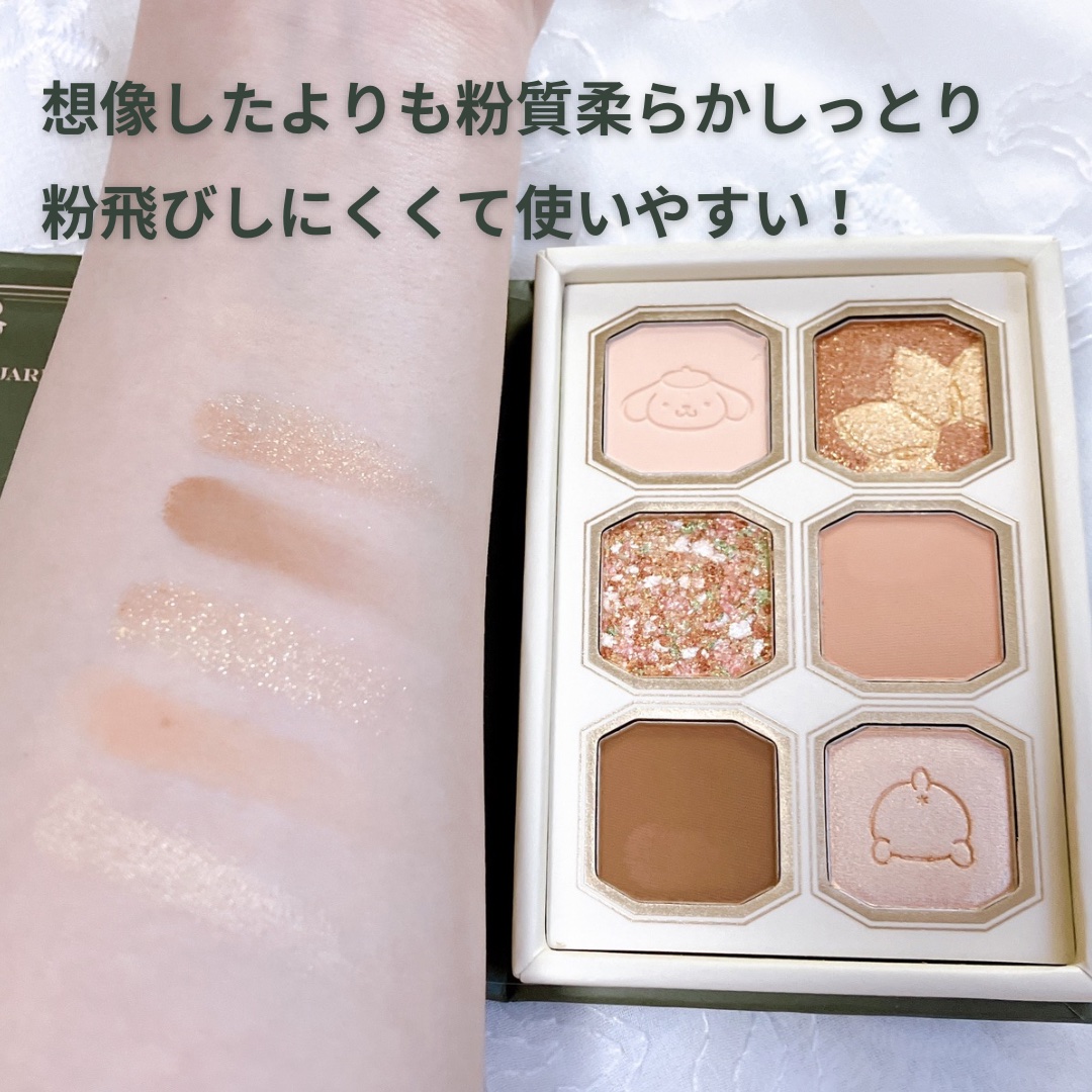 Mille Feeの絵画アイパレット、ポムポムプリンコラボ🍮 可愛いすぎる型押しはそーっと使ってる😂 パールラメとマットが3色ずつでバランス良し👍 マットとパールだけ使えばベージュ大人メイクもできるし、ラメでキラキラメイクにもできる🤩 多少ラメ飛びあるのでベースなど仕込むと良いかな!