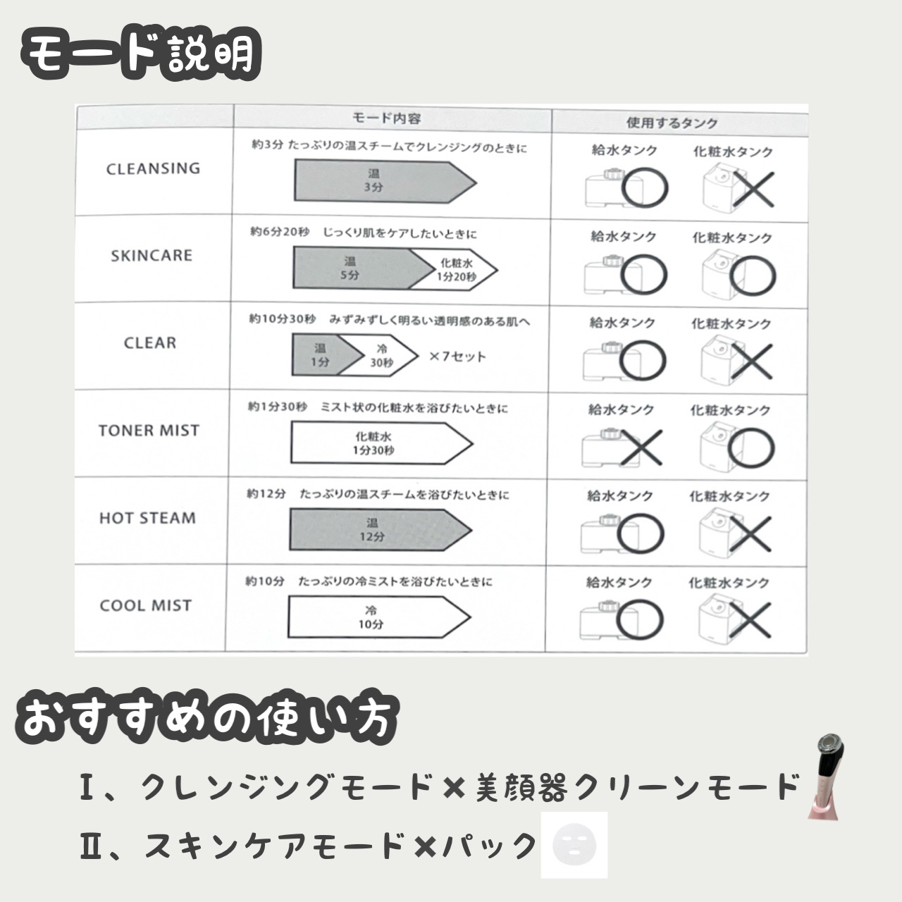 温&冷スチーマー音声動画有り🙆♀️自分の化粧水が使える💖冬こそスチーマーの季節☃❄ファースト美容家電としてエイジング世代からZ世代の子含めて全女子におすすめしたいアイテムです。私、スチーマー稼働してるもの今回のSALONIAピュアブライトスチーマーいれて3台過去に故障まで使い切ったモノまで入れると6台目となります価格帯としてもほぼサロニアと同じ価格帯か少し下までしか使ってませんそれくらいスチーマーが好きです(๑♡∀♡๑)スチーマーの選び方のコツとしては渋沢2枚超えたら付加価値競走で何処まで求めるかです‼️微粒子ミスト当たり前きちんと時間で停止この価格帯になると水弾丸的に飛んでくることはほぼないサロニアピュアブライトスチーマーも微粒子ミストで気持ちが良いミスト量調節は距離になりますがダブル温ミストタイプモードにもよりますが多い方だと思います💖そして永遠にタンク無くなるまで型ではなくきちんと時間で止まる❣️付加価値要素手持ちの化粧水が使える💖冷ミストも可能❣️各機能単独起動が可能特に単独起動って案外出来ない機器が多いのでSALONIAのピュアブライトスチーマーの大きな付加価値の1つ最大は手持ち化粧水だと思いますが制限有ります。エマルジョンなど粘土の高い化粧水NG医薬部外品&拭き取り化粧水NG酸化チタン、酸化亜鉛、シリカ、酸化銀、自金を含んだ化粧水、固形物を含んだ化粧水はNG逆を言うならそれ以外なんでも使えるので幅広く手持ちの化粧水を微粒子ミストに出来てしまう💖ちょっとびっくりした点冷ミストと化粧水ミストは音がブーンと結構する※動画音参照化粧水ミストは中身消えても風のみで稼働してる放置5分するとコンセントから入れないと完全停止機能により起動出来ない逆に機械的安全機能として良かったのは敢えて途中で水が尽きる様にしたら空焚きせずに温スチーマー機能の時はちゃんと止まります❣️これ大事だなと思います最後にピュアブライトスチーマー検討する時迷うであろう点最短1分30秒の化粧水ミストモードですが最長は約12分、よく使われると思われるスキンケアモード6分20秒クリアモード10分30秒何もせずに大人しくしてるの苦手!って人は自己責任になりますがクリアモードなら結構濡れますので防水有りのウォーターピーラーの使用がオススメですꉂꉂ(ˊᗜˋ*)スキンケアモードもそこそこ濡れるので完全自己責任ですが私は美顔器使ってみました(๑•̀ㅁ•́ฅ✨あと定番としておすすめなのはフェイスマスクつけるのおすすめ✨トータルとして付加価値要素が多いSALONIAピュアブライトスチーマーは冷があるから夏でも使いやすく通年使えるのでおすすめ出来る多機能スチーマーです色も新色ベージュはインテリアと同化させやすいカラーなので使いやすいと思います😊最後に自分で買い足して欲しい!出来れば今後メーカーさんがつけてくれたら嬉しいものとしてはスポイト(´・ω・`)化粧水タンクに化粧水入れるの結構大変😰パヒューム入れ替えるのに使う注射器みたいなスポイトか簡易でも良いからスポイトあるとタンクに入れるのが楽になると思います(*^^*)もしくは最初から手持ちの化粧水そのものをポンプ式容器に詰め替えてしまうと化粧水タンクに詰めるのが楽かな?っと思いました動画について動画は温ミストと冷ミストモードのものです冷ミストモードと化粧水ミストモードは出てくる場所は違いますが音はほぼ同じです#PR#SALONIA#LIPSプレゼント#サロニア#ピュアブライトスチーマー#ベージュ#美容家電#スチーマー#多機能スチーマー