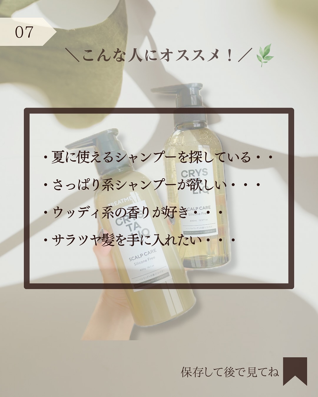 📖 ́͏̖-11種類のスキャルプケア成分を配合したノンシリコンシャンプーノンシリコントリートメント🌿Crystaliq@crystaliq_sharp_jp🌿ノンシリコンシャンプー🌿ノンシリコントリートメント▷▶▷泡立ちの良いシャンプーでスッキリ洗い滑らかなトリートメントでしっとりまとめる!きめ細かいクリーミーな泡が皮脂などの汚れを優しく洗い流して潤いを与えてくれる🌿根元からふんわりして、指通り滑らかに仕上げてくれる!深呼吸したくなるハーバルウッディ(ひのき)の香りでリラックス!#シャンプー#トリートメント#ノンシリコン#スキャルプケア