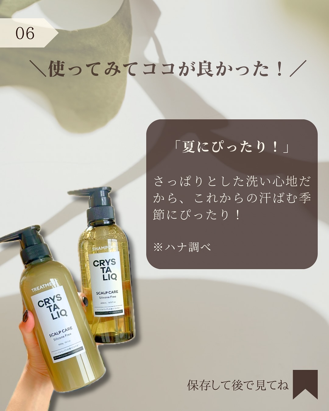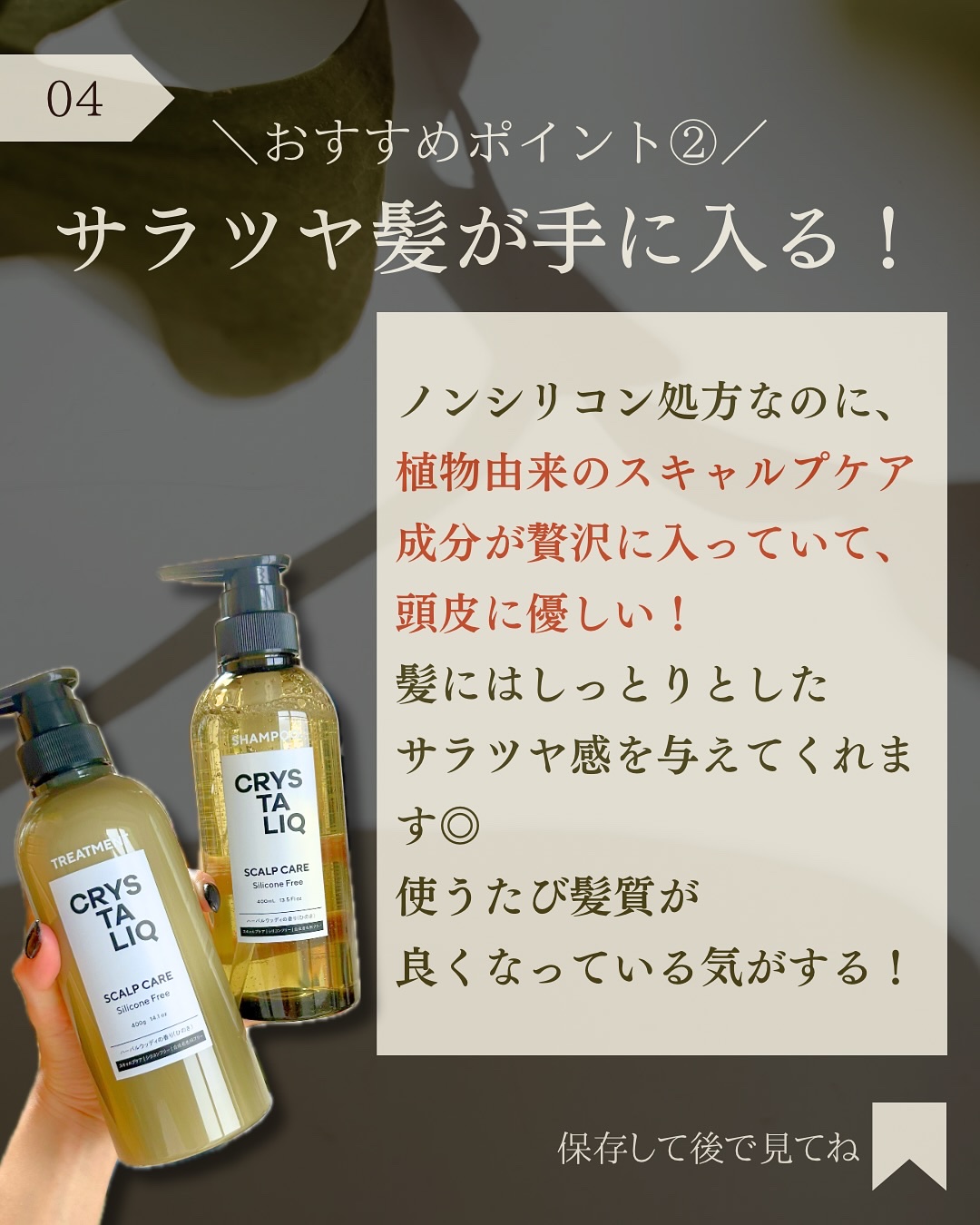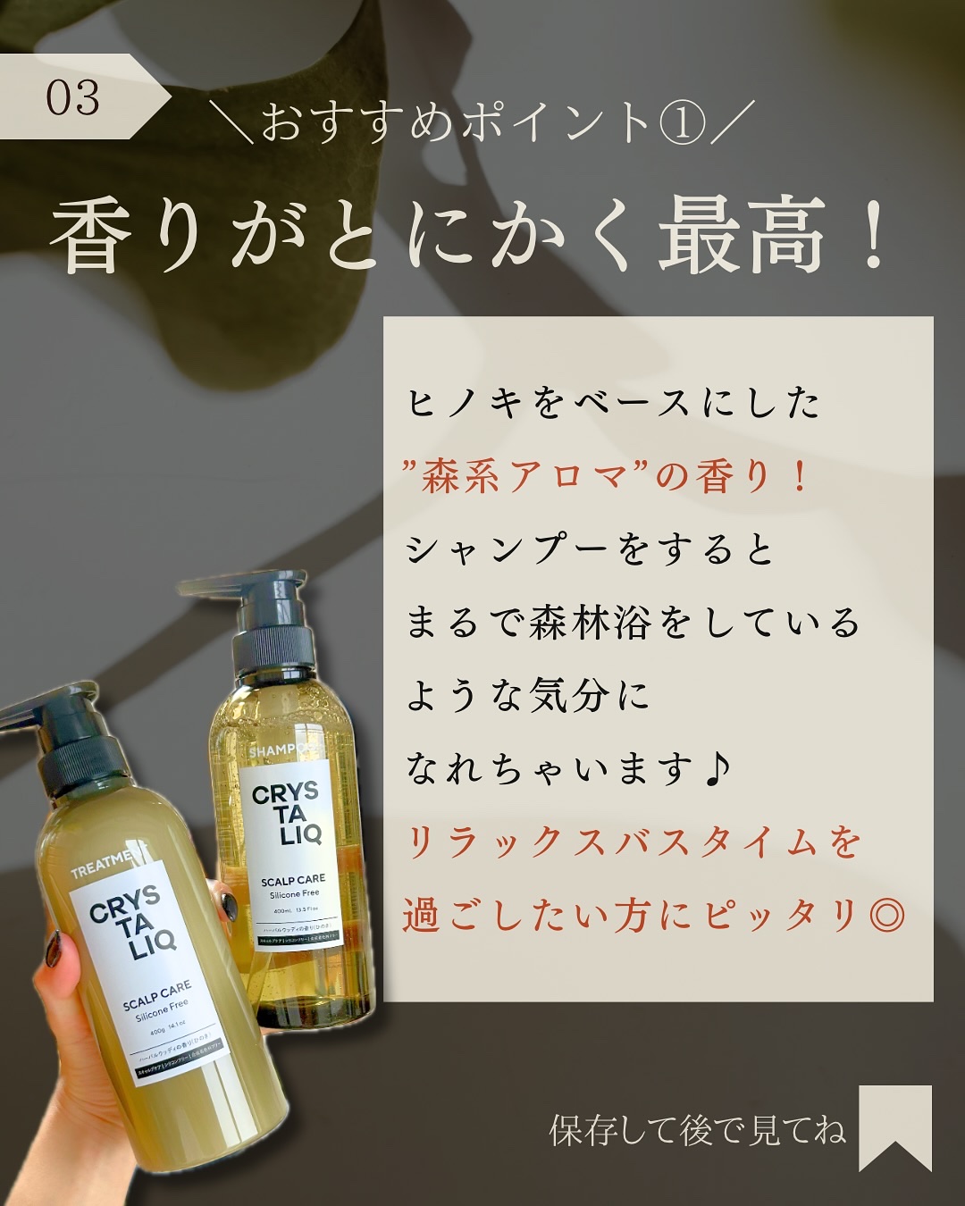 @hana.skincare._👈素肌をキレイにする混合肌スキンケア「サラツヤ髪を手に入れたい方集まれ!」\ノンシリコン処方!/✓地肌のべたつきが気になる方へ!✓髪のパサつきが気になる方へ!🌿商品詳細クリスタリークスキャルプケアシャンプー&トリートメント📌おすすめポイント✓ヒノキをベースにした”森系アロマ”の香り!✓髪にはしっとりとしたサラツヤ感を与えてくれます◎✓シャンプーをするときに大事な泡立ち感も◎@crystaliq_sharp_jp====================================ハナ|素肌をキレイにする混合肌スキンケア🌿\ツヤ肌目指す・美肌ケア💎/◆美容に目覚めて12年目のスキンケアマニア◆テカリ&乾燥 悩みの多い混合肌さん向け◆ドラコスメイン/コスパ◎のスキンケア紹介《成分・効果を徹底解説》◆自分に合ったスキンケア選びができるようになる🌿====================================@hana.skincare._👈いいね・フォロー・保存・コメント・DMなど、とっても励みになります!😳✨#PR#sharp#supportedbysharp#crystaliq#シャープ#クリスタリーク#頭皮ケア#地肌ケアマニア#地肌ケア用品#頭皮ケア紹介#頭皮ケア好き#頭皮ケアオタク#シャンプー難民#シャンプーレポ#シャンプーレビュー#ヘアケア商品#プチプラシャンプー#シャンプー購入品#シャンプー用品#頭皮ケア購入品#ドラコスシャンプー#地肌ケア#シャンプー#トリートメント#頭皮ケア#サラツヤ髪#さらつや髪#ノンシリコン処方#ノンシリコン#ノンシリコンシャンプー