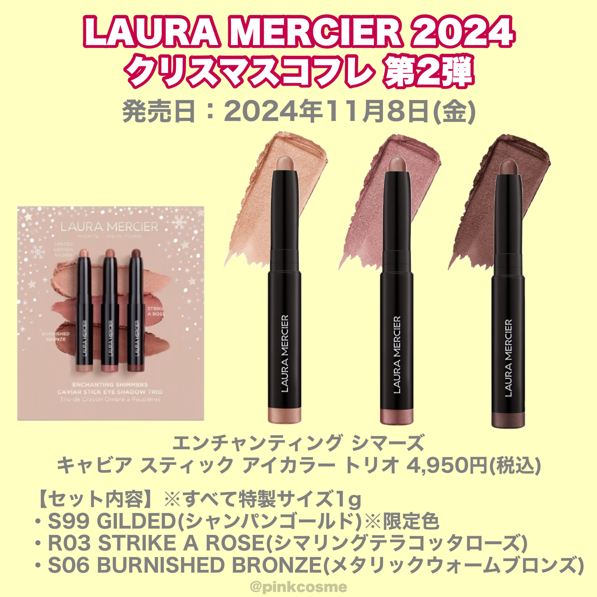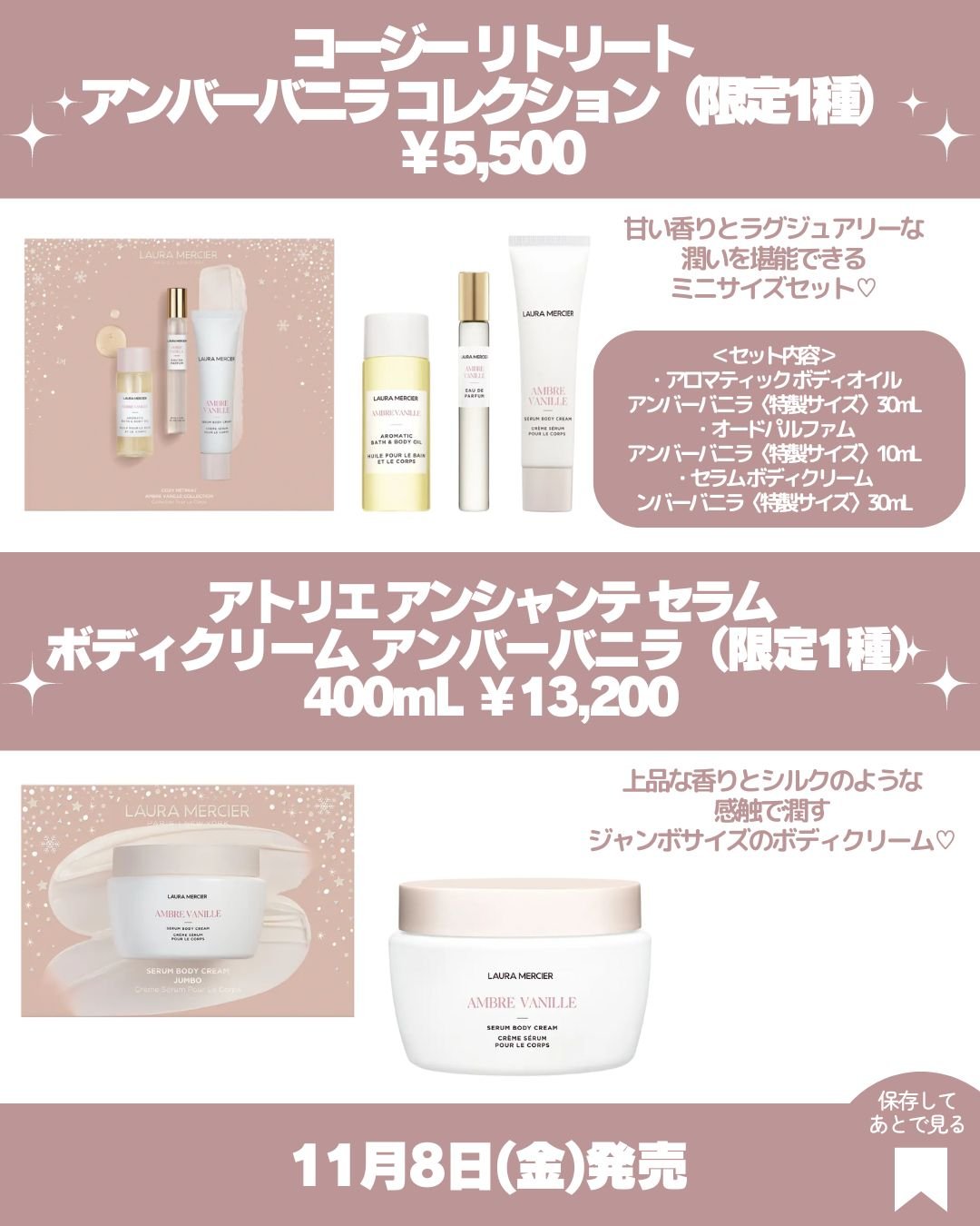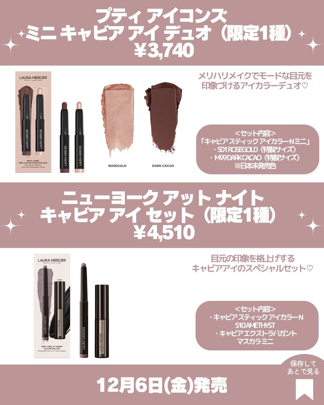 【速報!クリスマスコスメ2024】LAURAMERCIERクリスマスコスメ第1弾・第2弾・第3弾まとめて紹介💁♀️ローラメルシエのクリスマスコフレは毎年人気のブラシセットをはじめキャビアスティックアイカラーのセットなどお得なセットが盛りだくさん!【第1弾】発売日:10月18日(金)◻️ディヴァインリーフローレスルースセッティングパウダーウルトラブラー&パフ¥7,040(税込)マイクロサイズ2.5g¥2,200(税込)◻️ウィンターインタールードアイ&チークセット¥5,500(税込)◻️アトリエアンシャンテトラベルブラシコレクション¥9,460(税込)【第2弾】発売日:11月8日(金)◻️エンチャンティングシマーズキャビアスティックアイカラートリオ¥4,950(税込)◻️デカダントドリームススフレハンドクリームトリオ¥5,940(税込)◻️コージーリトリートアンバーバニラコレクション¥5,500(税込)◻️アトリエアシャンテセラムボディクリームアンバーバニラジャンボサイズ400mL¥13,200(税込)【第3弾】発売日:12月6日(金)◻️プティアイコンズミニキャビアアイデュオ¥3,740(税込)◻️ニューヨークアットナイトキャビアアイセット¥4,510(税込)┈┈┈┈┈┈┈┈┈┈┈┈┈┈┈┈これはお得すぎる…お試しにもミニサイズは嬉しい!ミニサイズは旅行や持ち歩きにも便利だよね!使い切りもしやすいし◎日本未発売カラーもあるよ!是非チェックしてね!────────────少しでも参考になったらフォロー、♡、クリップよろしくお願いします!────────────#LAURAMERCIER#ローラメルシエ#アンバーバニラ#キャビアスティックアイカラーN#ローラメルシエ_キャビア#クリスマスコフレ#クリスマスコフレ2024#クリスマスコスメ#クリスマスコスメ2024#ホリデーコスメ#ホリデーコスメ2024