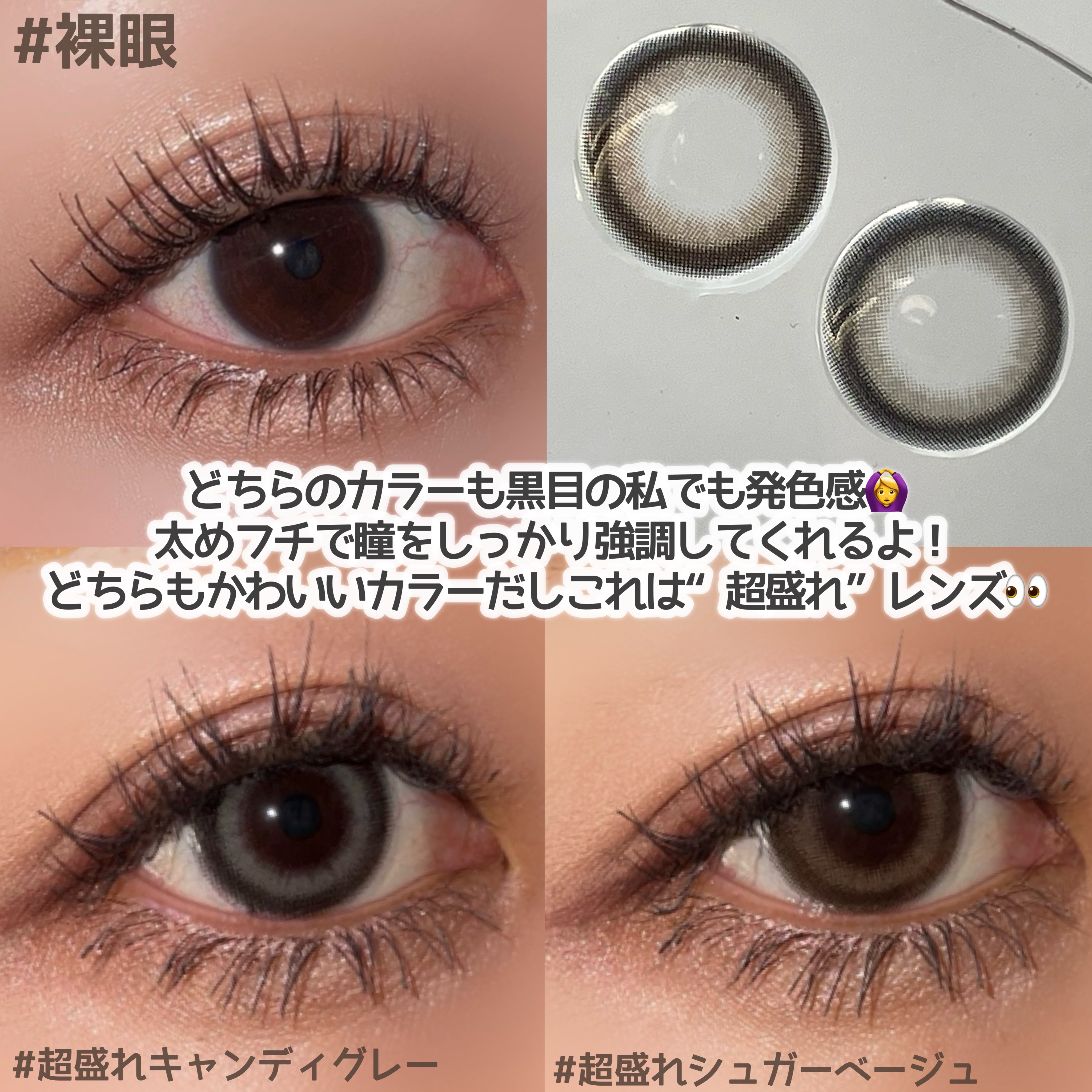 超盛れキャンディグレー ふわっとした太フチ×白みグレーの組み合わせが可愛すぎる!着色直径14mmよりも小さめに感じました◎ 超盛れシュガーベージュ 甘めのラテカラーでキャンディグレーの色違い◎ ブラウン系が好きな人はこっちがオススメ! 超盛れリングパール ブラウン系の細フチとしっかりと発色するグレーの組み合わせがクールで上品な雰囲気に。
