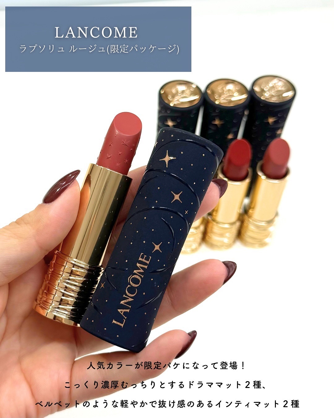 - 【2024クリスマスコフレ】 数量限定 2024ホリデー ランコムのアイコンリップ、ラプソリュ ルージュがよりラグジュアリーにリニューアル。 ローズ由来の保湿成分*を配合した付け心地の良さが、あなたを至福の時へと導きます。 心地良さに身を任せたら、あとはあなたを魅せる色を選ぶだけ。#至福のフレンチリップ * センチフォリアバラ花エキス・ダマスクバラ花油・ハイブリッドローズ花エキス(全て保湿成分として) ※11/1 数量限定 全国発売