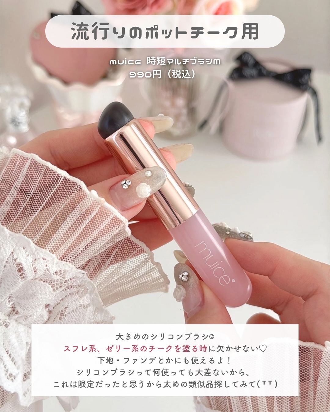 muice初のメイクツールが発売。ブラシはSとMサイズがあり、私はMを購入。Mサイズはファンデーション・リキッドハイライト・リキッドチークを頬の広い面に使用する際におすすめ。 先端はやわらかいシリコンタイプのブラシ。使った後は1回ずつ洗わなくてもOK、さっと拭くだけ。お手入れラク。 税込¥990なのも嬉しい。限定なので気になる方はお早めに。