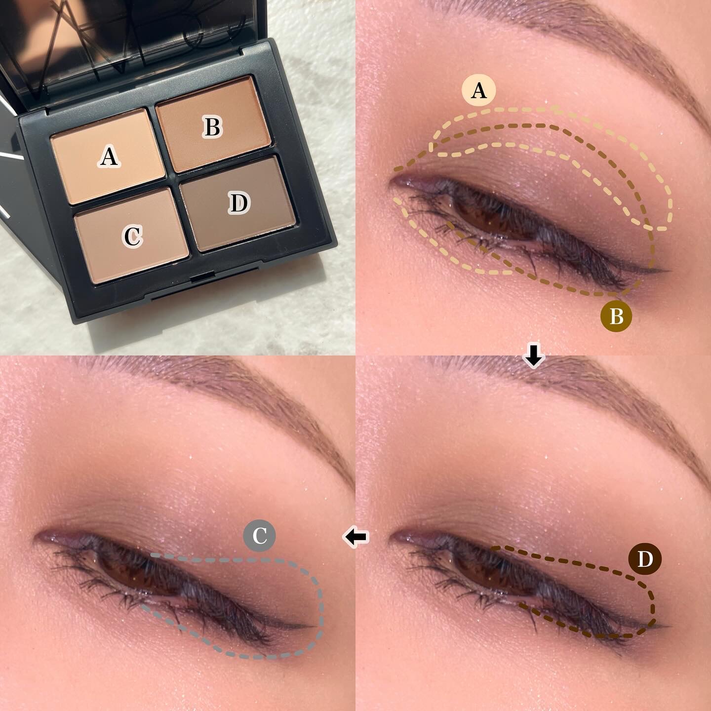 先日発売されたクワッドアイシャドーの新色! どちらもマットがメインになっていてなめらかな粉質で扱いやすいテクスチャー✨ ニュートラルなブラウンパレットでピリッと辛口なブラウンメイクに。 右上のアプリコットカラーが肌に馴染みつつもほどよく主張してくれてお気に入り🫶