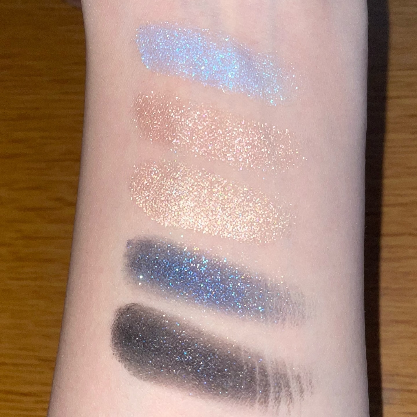 夜空に輝く星のような煌めきに惹かれて購入 パレ下段の2色はかなり硬めで下地に上段、中央のカラーを入れてからの方がぼかしやすい ブルー苦手な方も使いやすい色味に感じたよ💙
