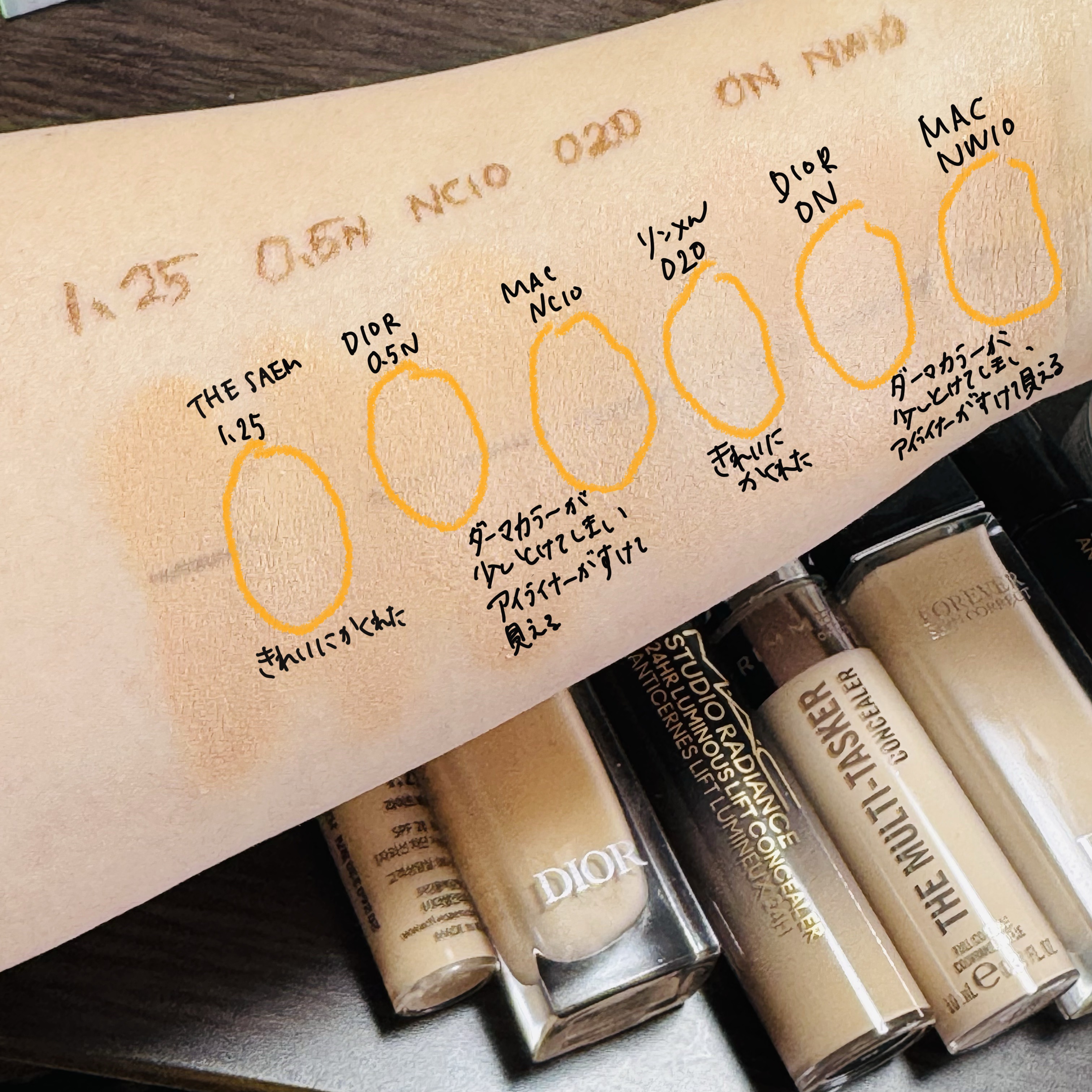 コンシーラーの色味比較その2!楽天ブランドデーで買ったMACはどうでしょう?ってことで、比較してみました。📝前回の知見『ザセム1.25≒ディオール0.5N』でした。さて今回どうかなー!点おきが2枚目ですね。3枚目が伸ばした姿です。MACの公式ショップでは他メーカーでの色味からMACでの近い色を教えてくれる素敵システムがあると思うんですが、だいたい正解な感じでしょうか。😃私はディオールの0Nがいい感じです💻MACではNW10がおすすめ!ってことでNW10をメインカラーとして購入したのですが、伸ばすと大体似た感じです。1日メイクしてマスクに着く具合からすると、MACのがやや持ちはいい気がします。とてもくっつく!というのはどちらもないですね。そして、なんというか。😳『ザセム1.25≒ディオール0.5N≒MACNC10』😳が驚きな感じでした!てことはリンメルの020も似た色味になりそうです。ザセムの1番明るい色味な0.5はディオール0.05Nと同じ明度ですが、黄味とピンクに振れている感。ザセムのブライトナーは持ってないのでわからないですけど、もしかしてディオール00と同じような感じなんでしょうかねー?ディオール00は完全白味なので、通常はハイライトに使うしかないと思います。次回はアイライナーをシミに見立ててカバー力チェックしてみよう✨#コンシーラー#比較レビュー