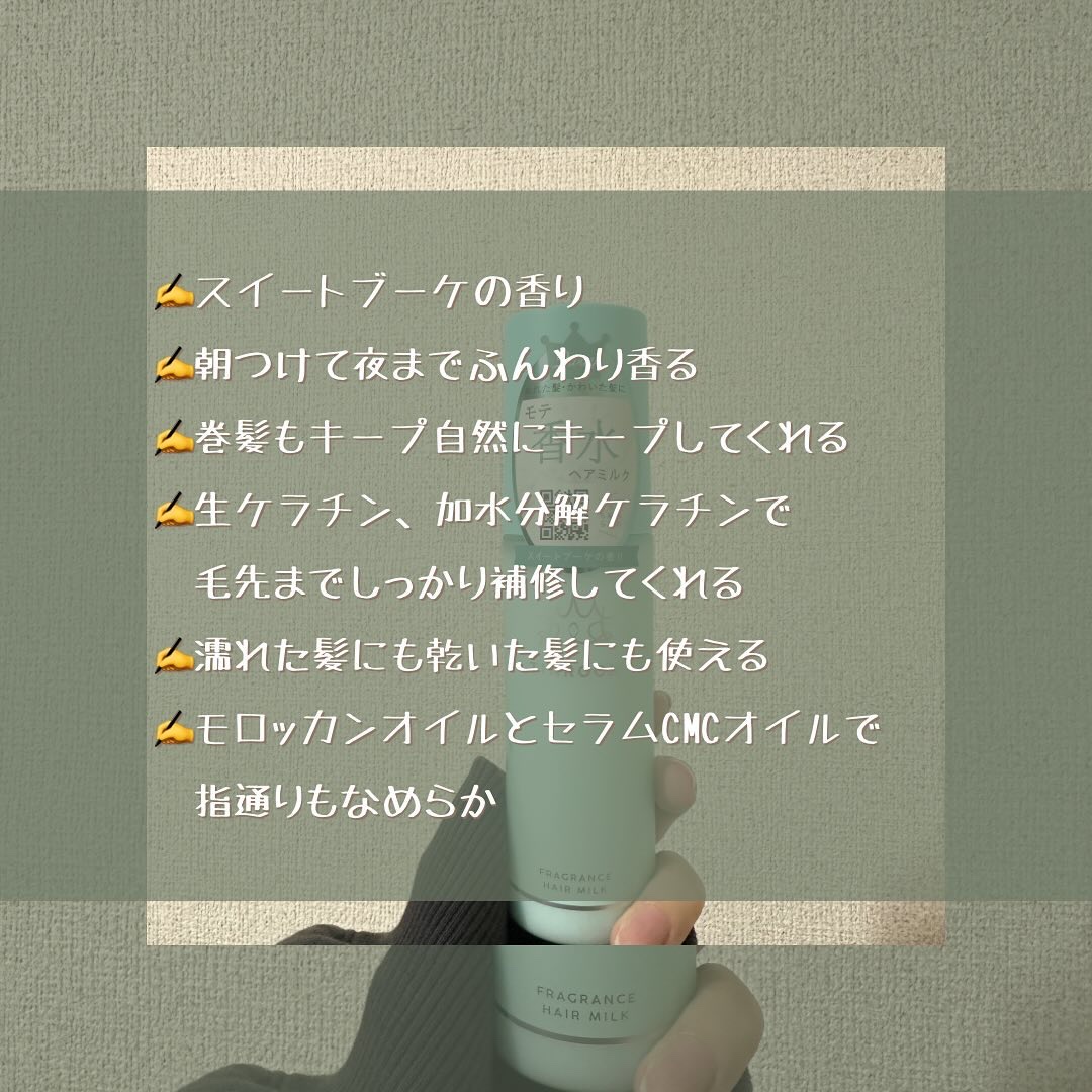 モテ香水ヘアミルク!髪の内部まで補修しながら香りを一日中楽しめるフレグランスヘアミルク! 生ケラチンと18MEA類似成分を配合。ダメージを受けた髪に栄養補給しながらキューティークルを整え、ヴェールをつくります。 フローラル系の良い香り😆 ミルクなので普通の乳液みたいにトロットしてる感じ、手がベタつき感じづらく使えることができるよ!
