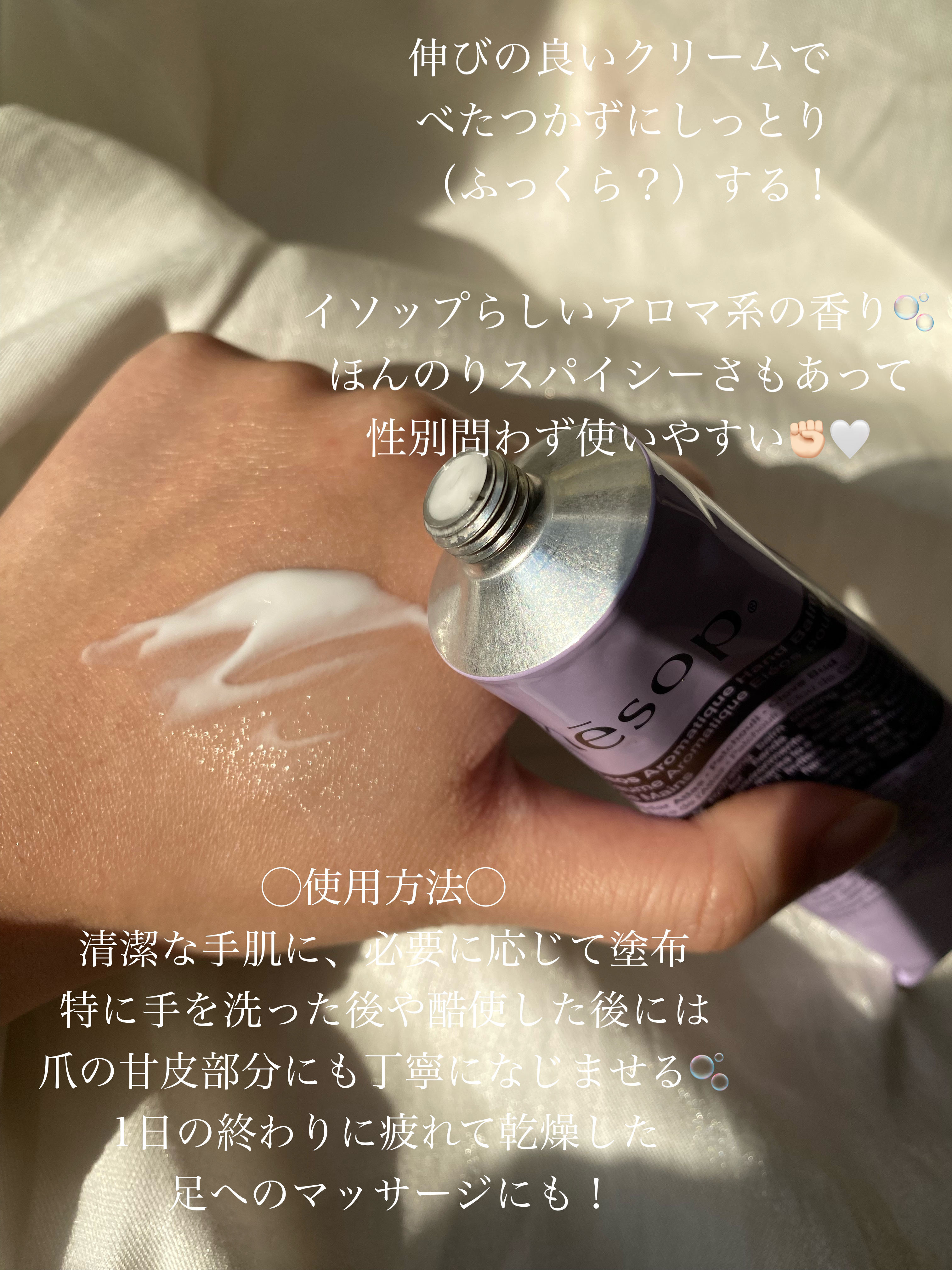 柔らかなクリーム 肌馴染みよくなめらかに伸び広がる 使い心地の良いハンドクリーム スーッと馴染んでベタベタ感は少なめ ツヤっと程よいしっとり感で肌をなめらかに仕上げてくれます! イソップならではのウッディでアロマのような香りが落ち着く🌿 深呼吸したくなるような香り