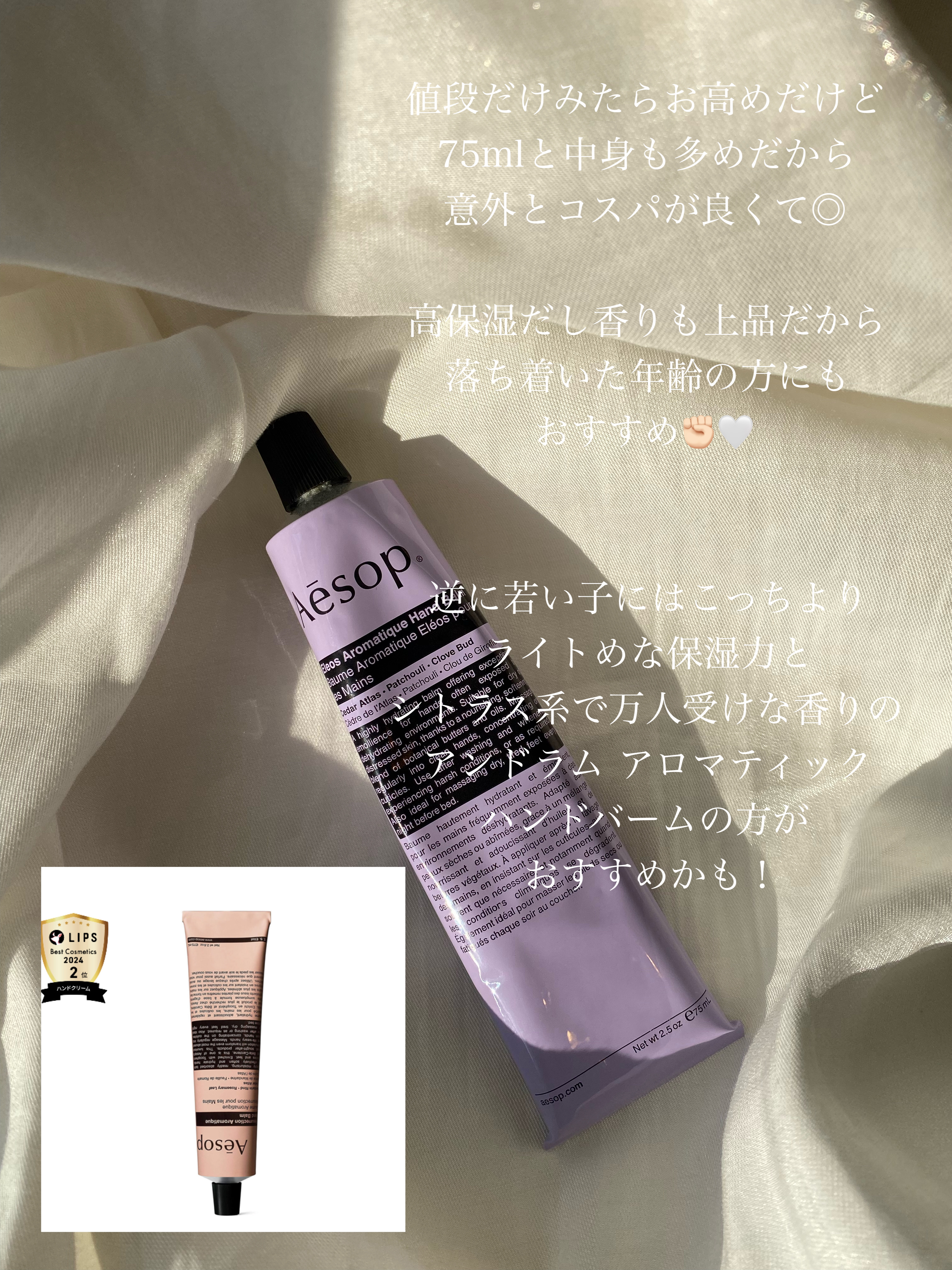 Aesopエレオスアロマティックハンドバーム75ml4,290円自分のご褒美にもギフトにもおすすめなイソップのハンドクリーム✊🏻🤍◯べたつかずにしっとり潤う ふっくらする感じ◯イソップらしいアロマ系の香り ほんのりスパイシーさもあって 大人っ...