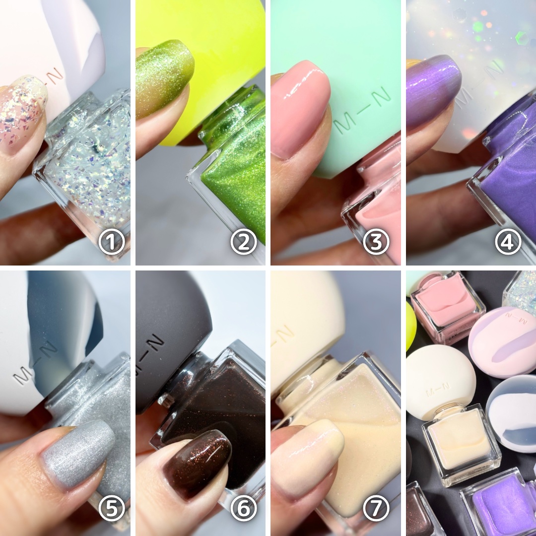 株式会社伊勢半様のMNネイル全色購入したのでスウォッチ、レビューします🥰⭐01BIRTHDAYGIRLオーロララメが単品、重ねづけ、アクセントに便利!マストバイカラー⭐02E.T.ふんだんなラメで気分の上がる春カラーフットネイルにも可愛いと思います!⭐03STUDENTクリーミーで可愛らしいいちごミルクみたいなピンク他のカラーとも相性良し!⭐04TIMETRAVELER偏光パールがにゅるんとした不思議なクリアパープルキツすぎないパープルでオシャレ!⭐05YETIラメが細かくギラギラしすぎない使いやすいメタリックシルバー大人も使えます!⭐06WITCH細かな赤ラメがミステリアスなシアーブラック他のブラックとは一味違う技ありブラック!⭐07PIYOピンクラメが入った珍しいクリームイエロー角度でちょっと違う印象になる可愛らしいカラー!パッと見のネイルボトルでとても印象的なこのシリーズ💅ラメが微細だから派手目のカラーも上品で肌になじみやすくとても使いやすい✌️それぞれの組み合わせもしやすく初心者の方から上級者まで楽しめそう❗ちょっと値段が高い、、😢すぐネイル変えたい民なので植物由来のオイルなどネイルケア成分配合なのはありがたい✨持ち手部分は取り外しが可能なので他の組み合わせにしたり外したり気分に合わせて変えられるのも楽しいですし、伊勢半さんのこういう遊び心があるところが好きだなと改めて感じた商品でした😊 #秋の先取りコスメ#ネイル