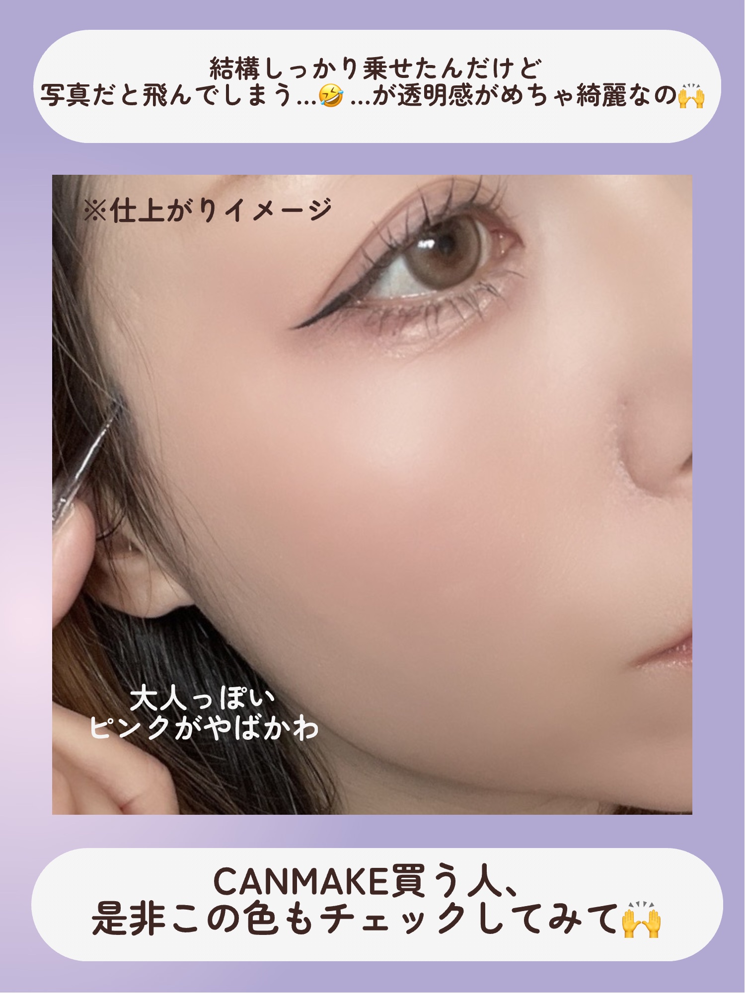 キャンメイクのこのシリーズのチークだいすき!! 粉質しっとりでパールによるツヤ感がキレイ🪄😊 新色はラベンダーっぽいピンク♡ 紫!って感じではなく、あくまでもピンクって感じで使いやすいと思う🥰 この価格で、この粉質で、この色味で、ブラシまでついてるキャンメイクってやっぱりすごい♡